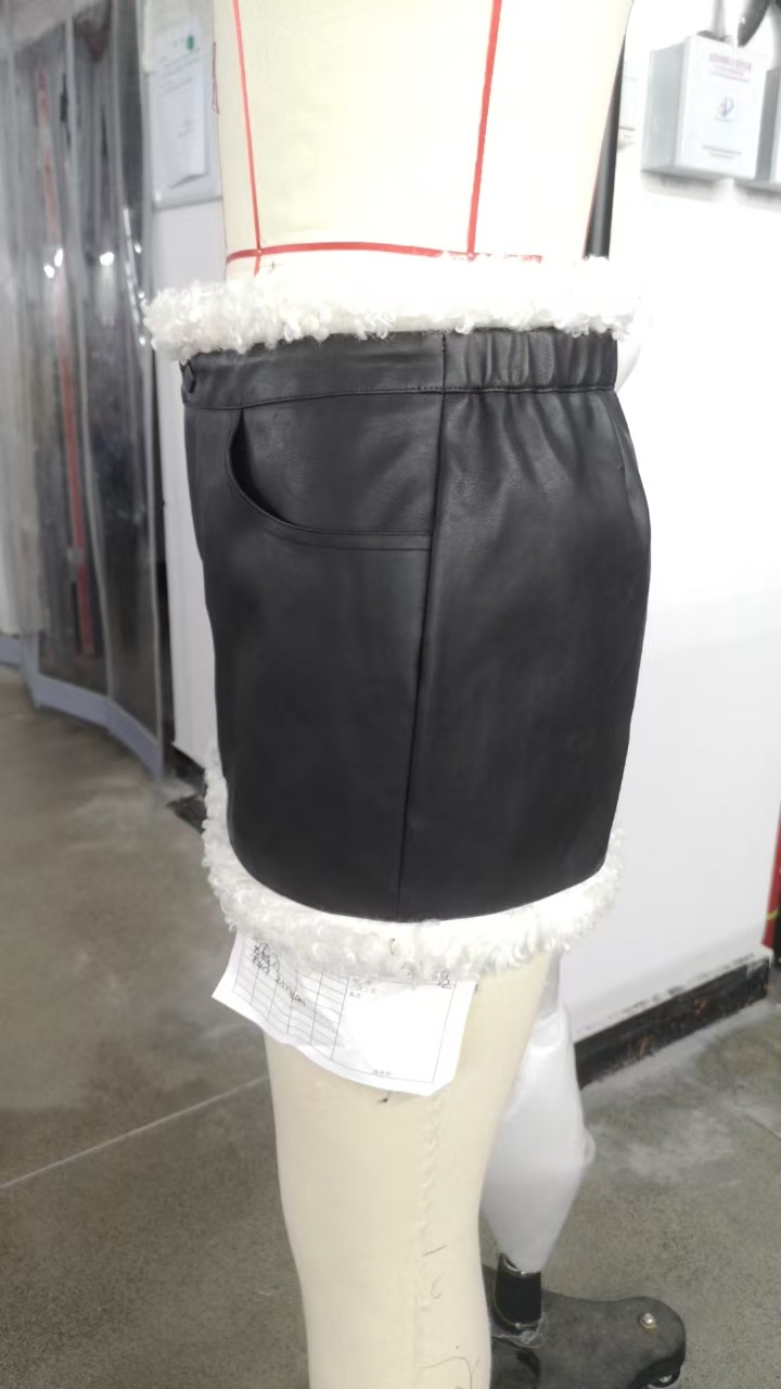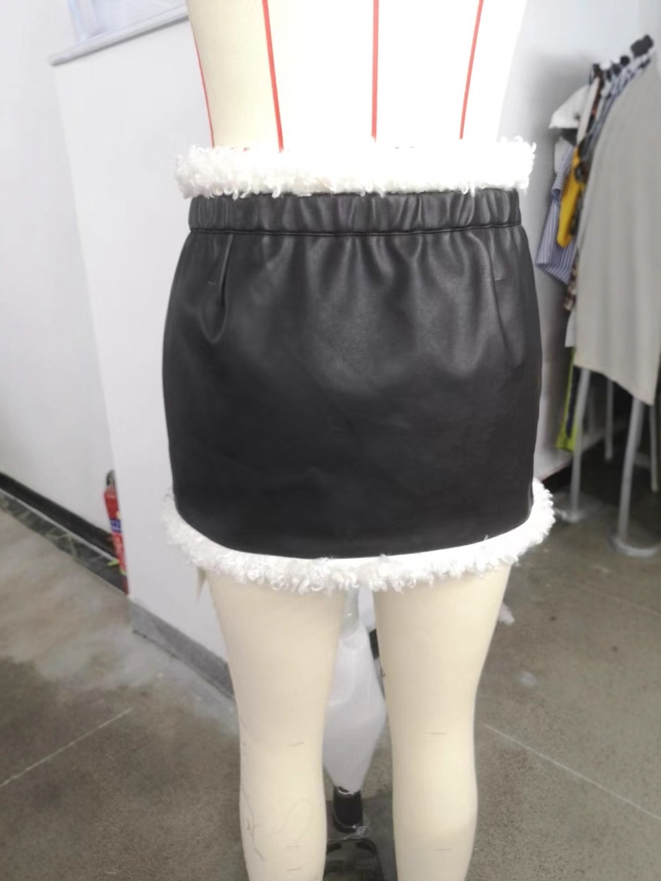 Autumn Winter High Street Plush Stitching Faux Leather Niche High Waist Slimming A line Mini Skirt