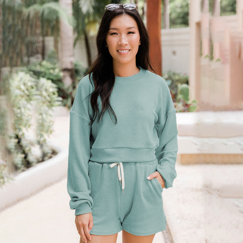 Autumn Winter Solid Color round Neck Pullover Long Sleeve Sweater Women Casual Shorts Suit
