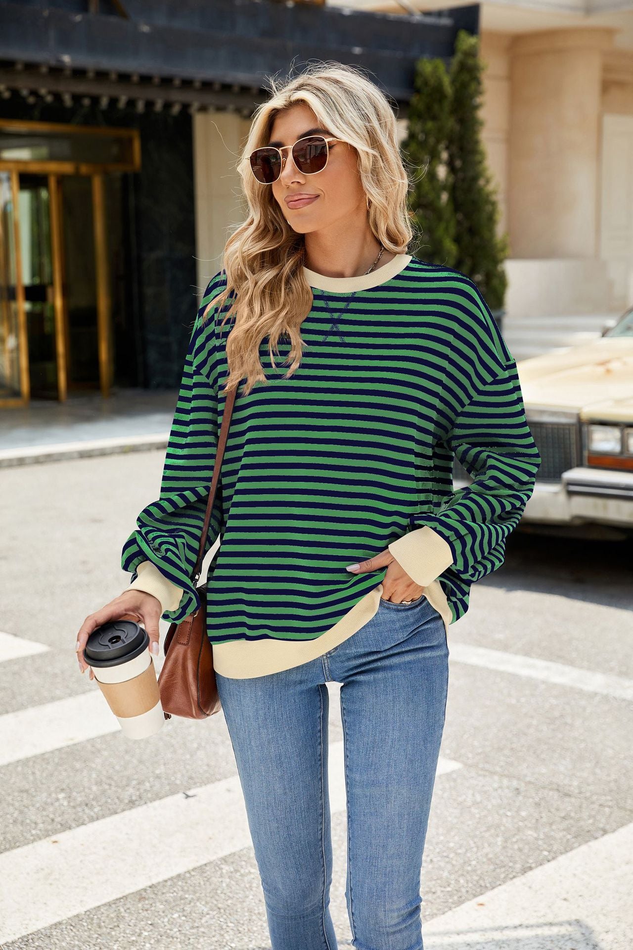Autumn Winter Striped Round Neck Contrast Color Loose Long Sleeve Sweatershirt Coat Women