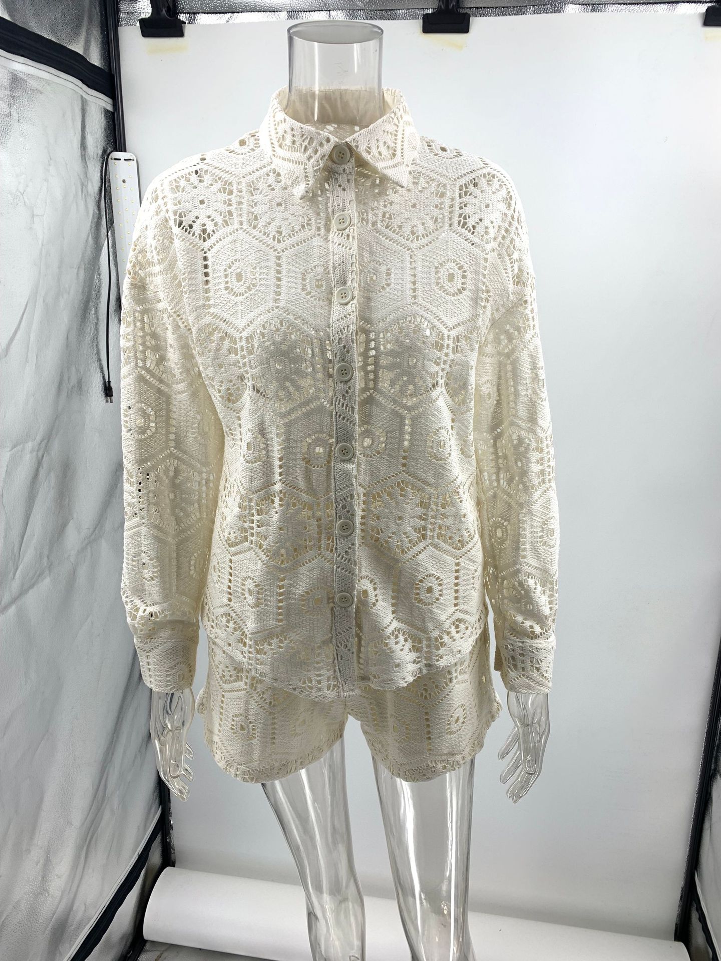 Casual Collared Single Breasted Stand Collar Top Lace Shorts Two Piece Sets