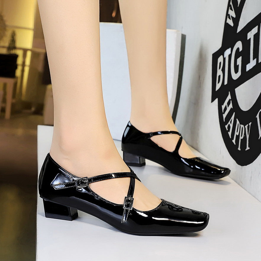 Dating Cross Women Strap Shoes Square Head Chunky Heel Metal Shiny Patent Leather Hollow Out Cutout out Pumps