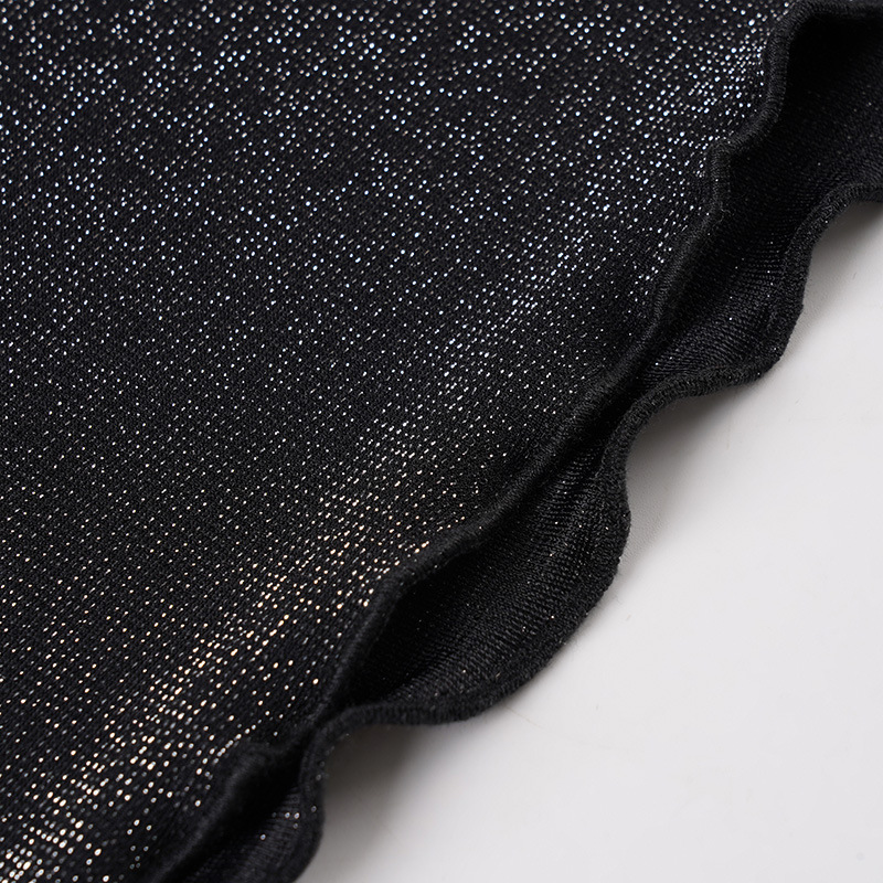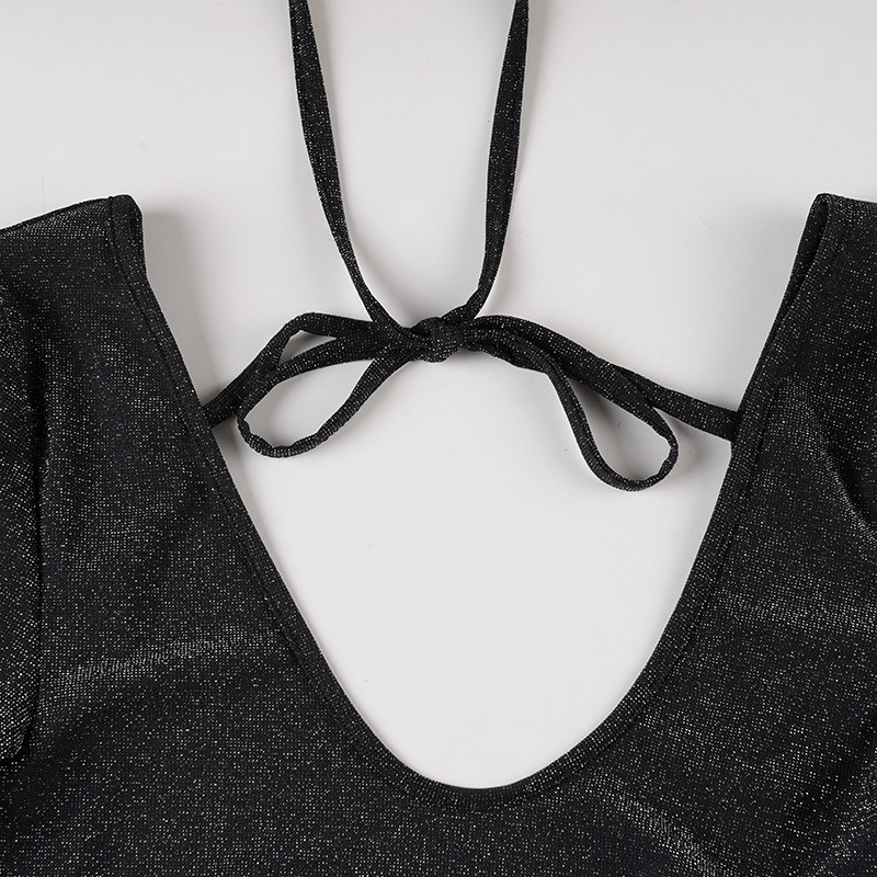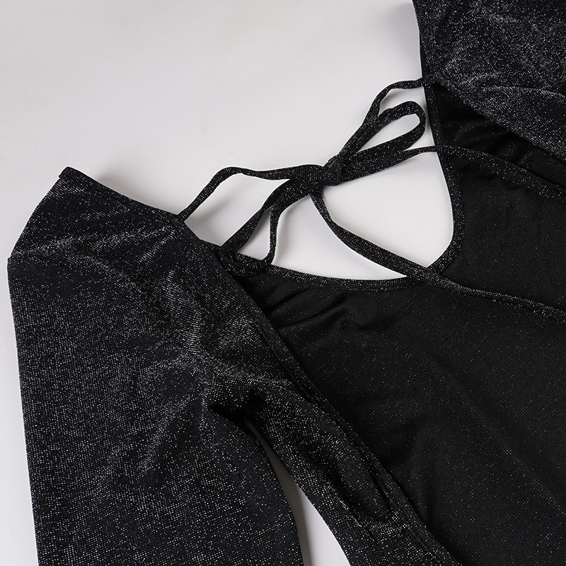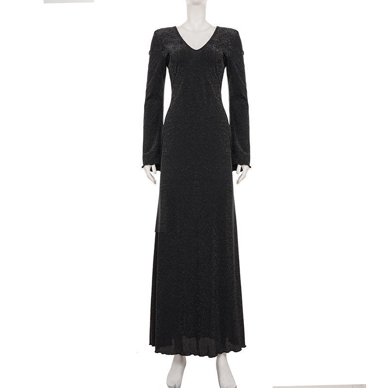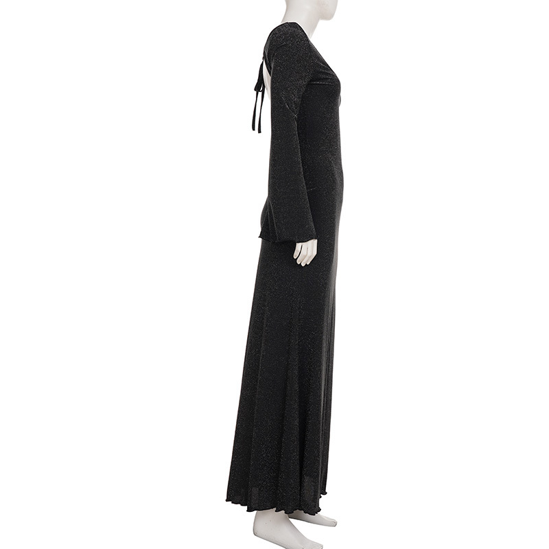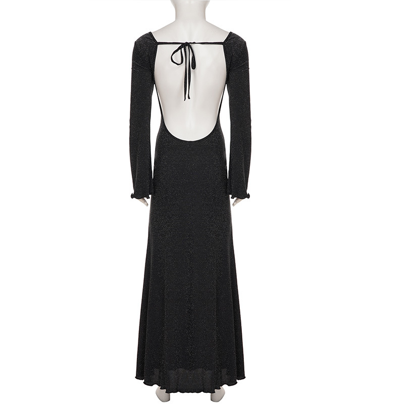 Elegant Formal Dress Sexy Backless Stretch Knitted Bright Silk Flared Sleeves Long Sleeves Dress Women