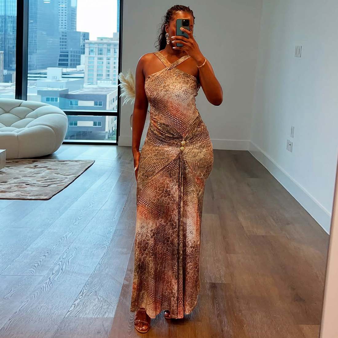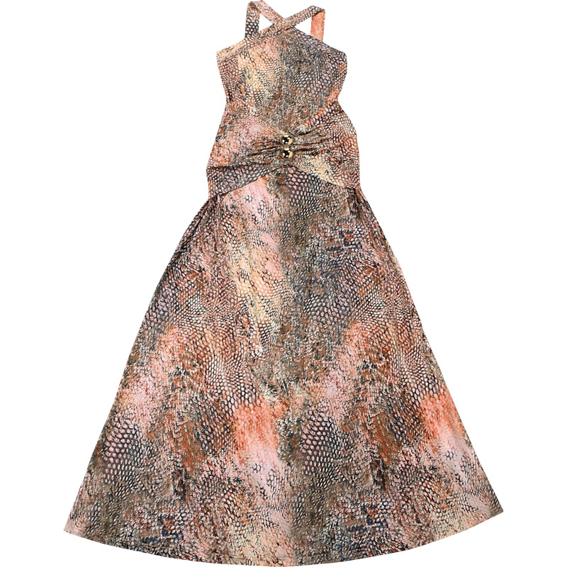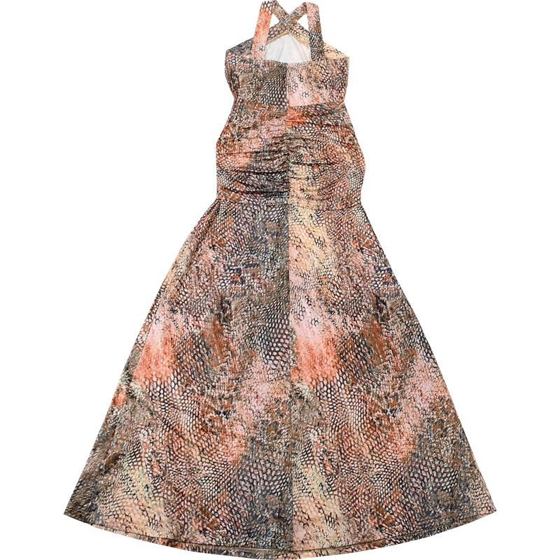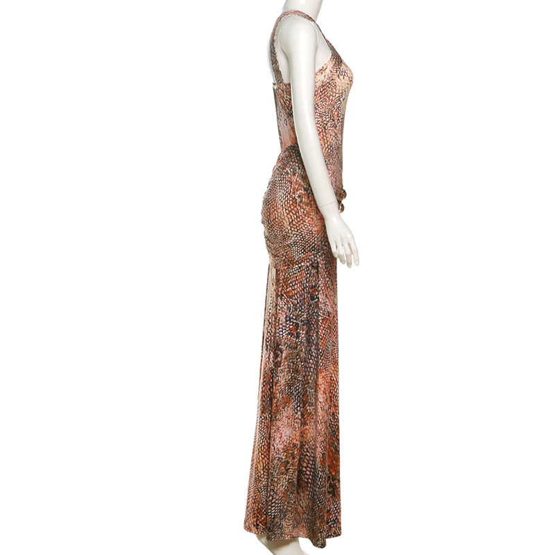 Fall Women Clothing Elegant Slim Pleated Print Maxi Dress Sling Dress