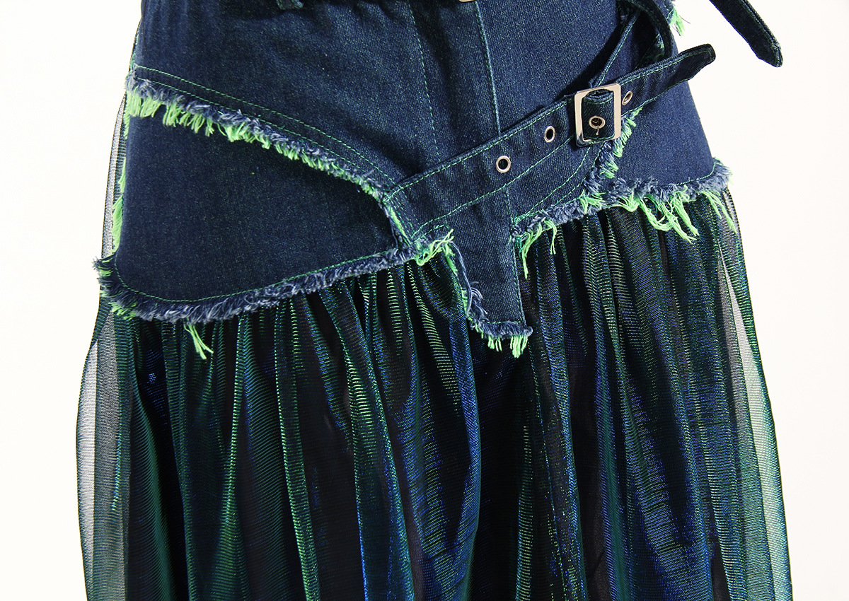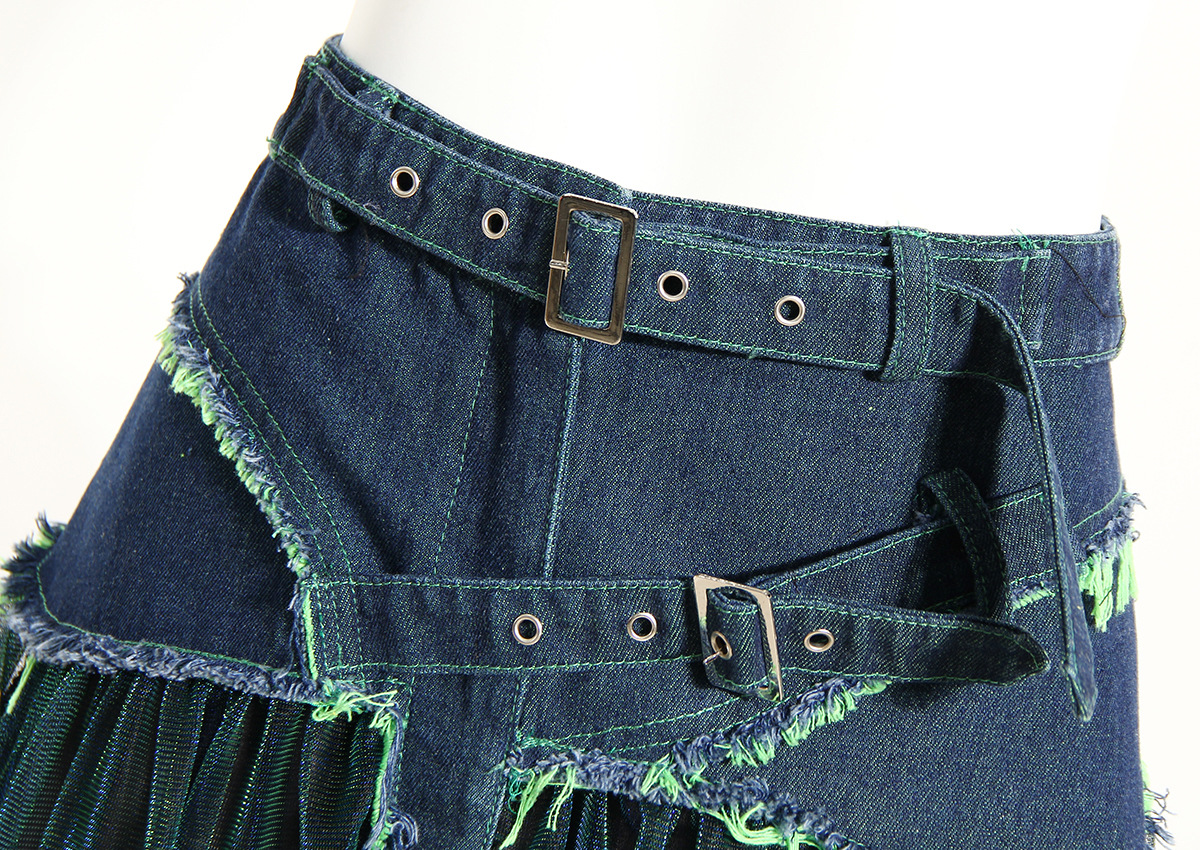 Niche Design Summer Denim Stitching Colorful Mesh Skirt Contrast Color High Waist Slimming Mid Length A line Skirt