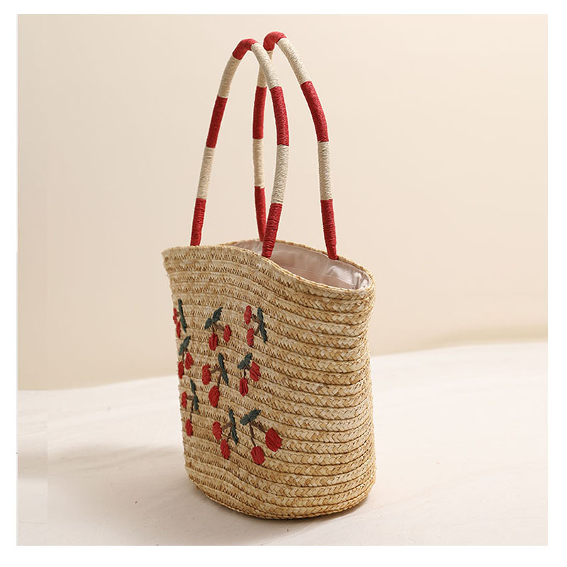 Niche Embroidered Cherry Shoulder Straw Bag Large Capacity Straw Woven Bag Seaside Vacation Beach Bag