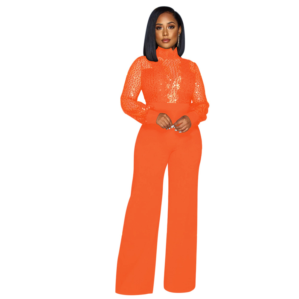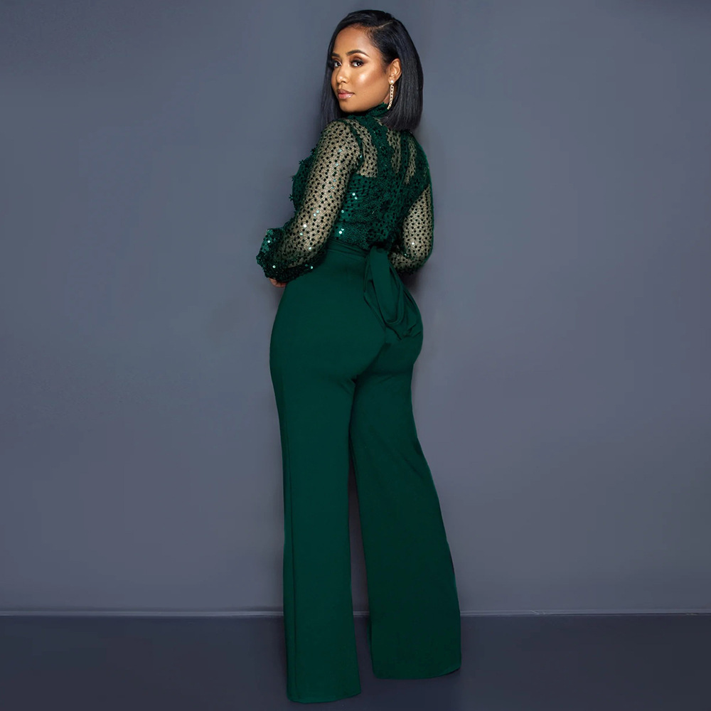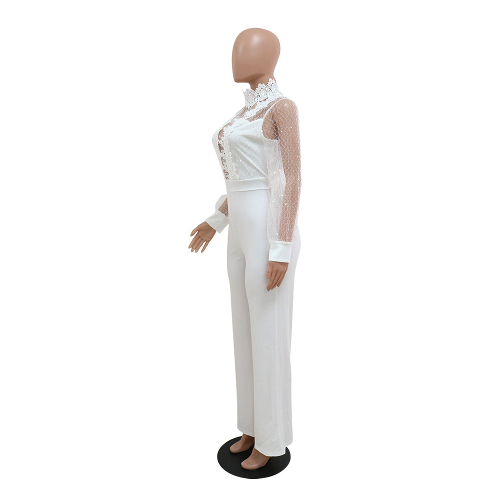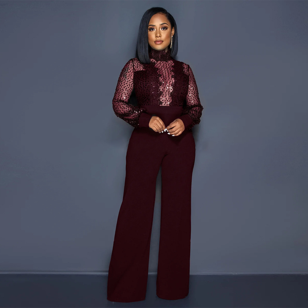 Party Turtleneck Sequin Lace Sheer Long Sleeve Top Loose Jumpsuit Women