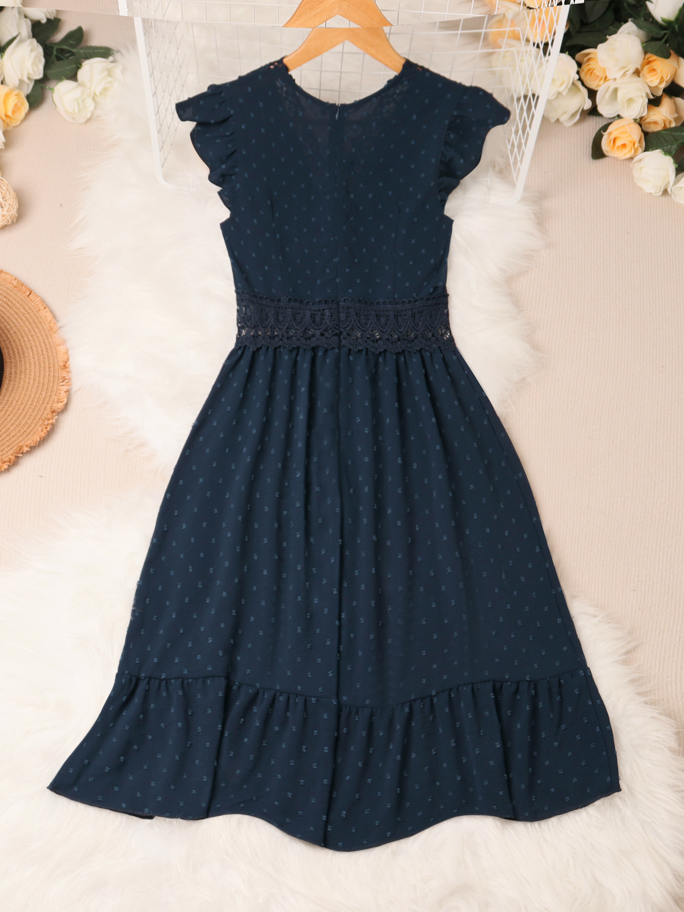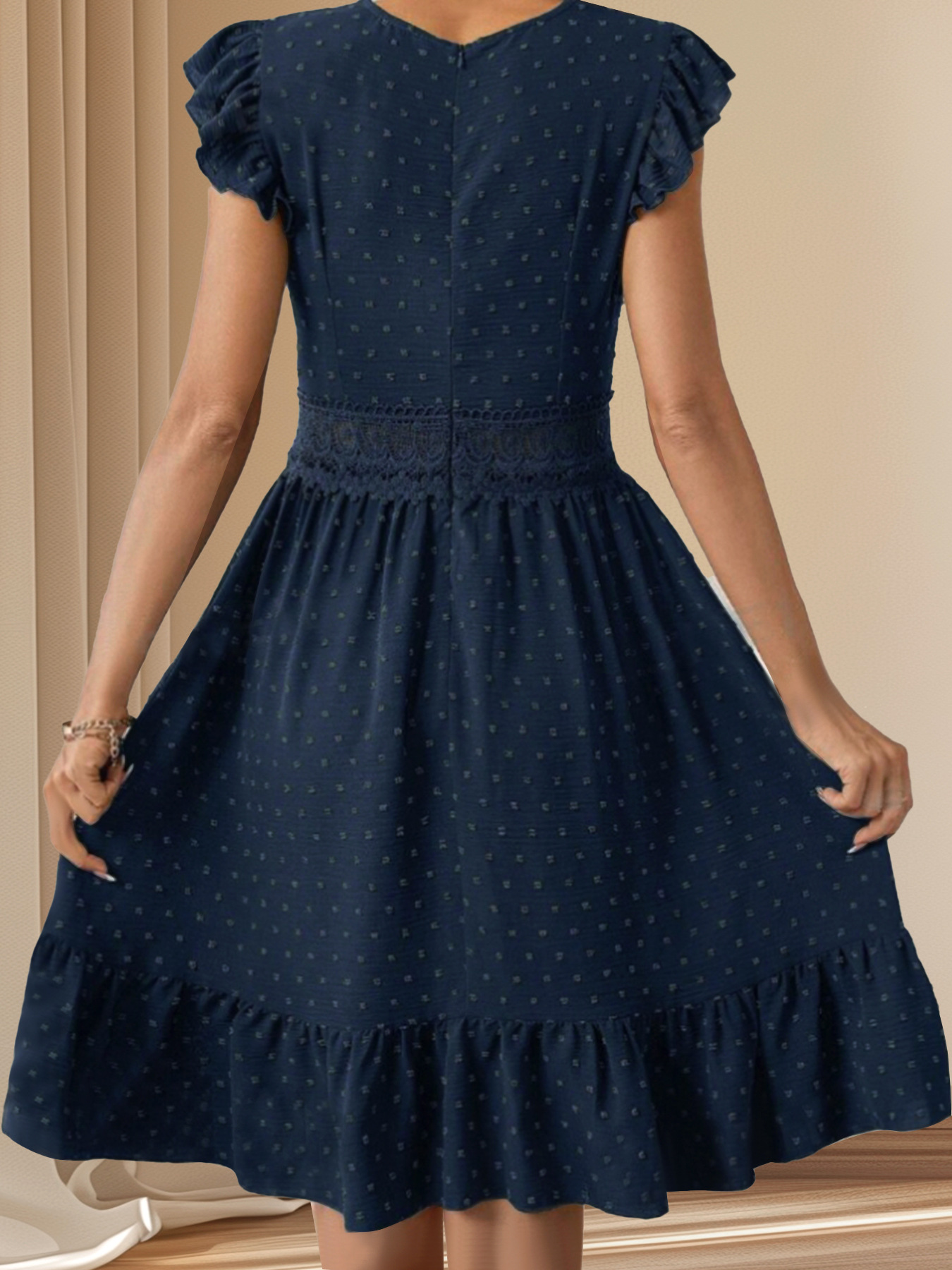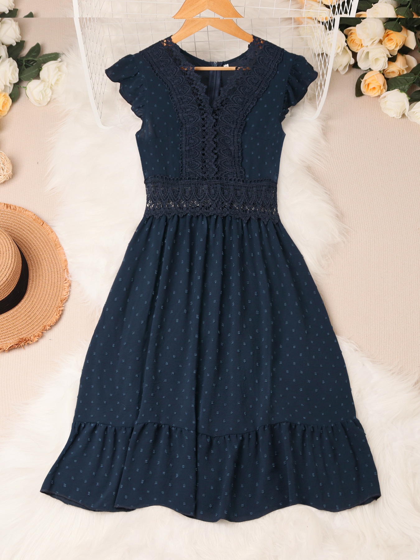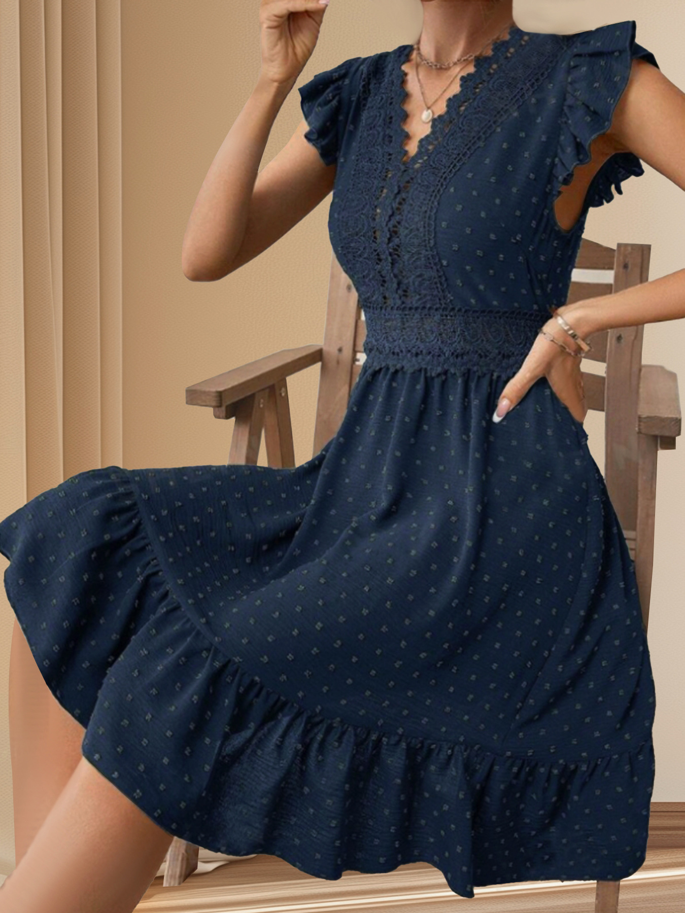 Popular Lace Stitching Pleated V neck Flying Sleeve Elegant Dress