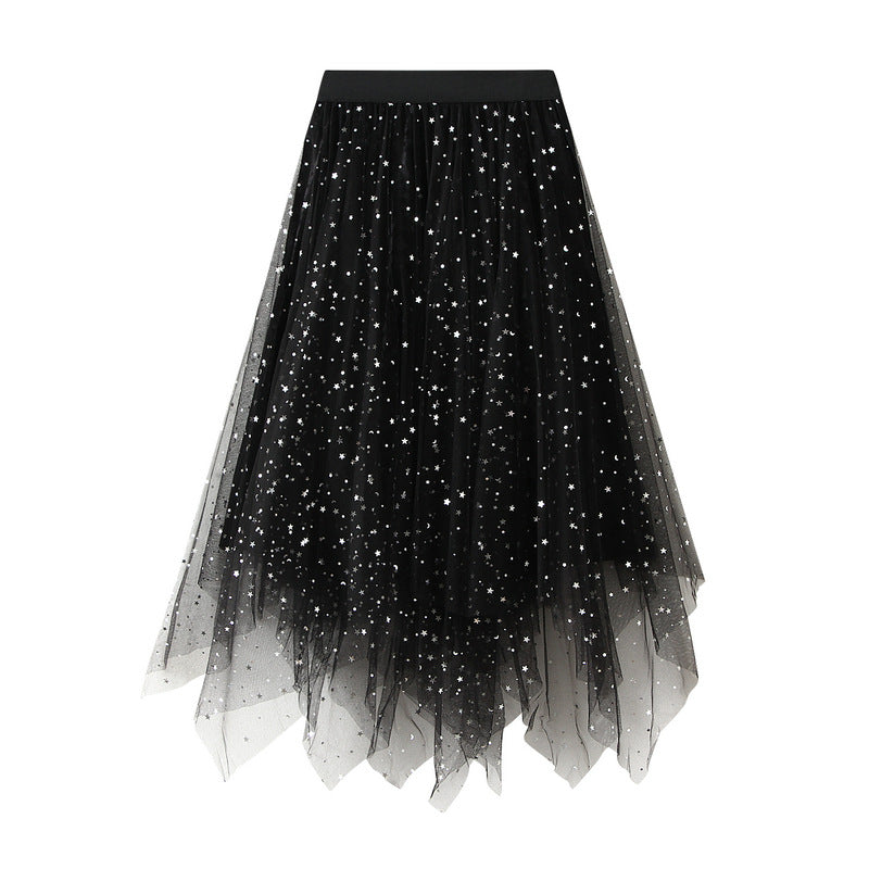 Puffy Starry Sky Mesh Skirt Autumn Korean Irregular Asymmetric Velvet Dress Mid Length Women