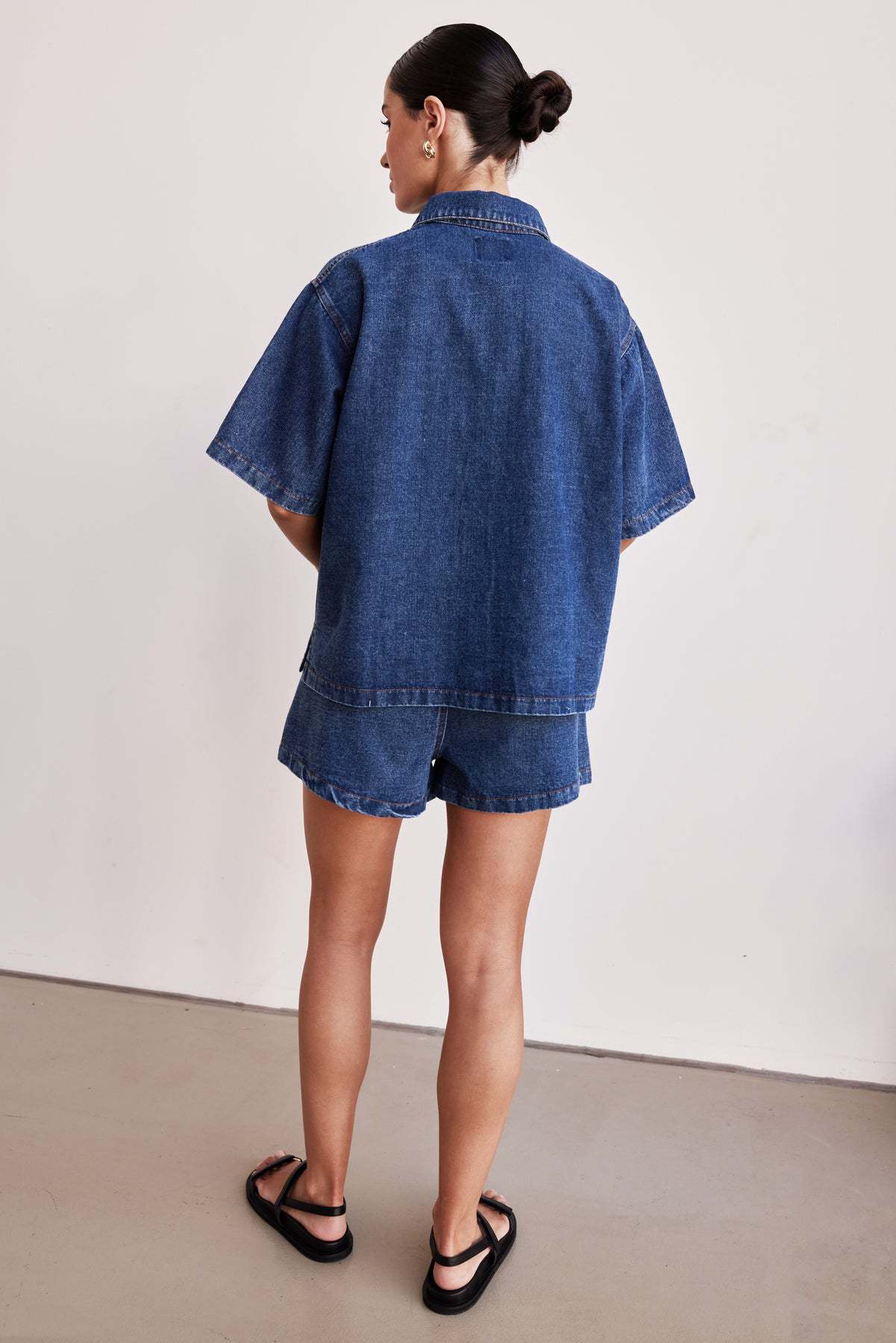 Retro Casual Loose Pockets Short Sleeved Shirt Shorts Denim Two Piece Sets