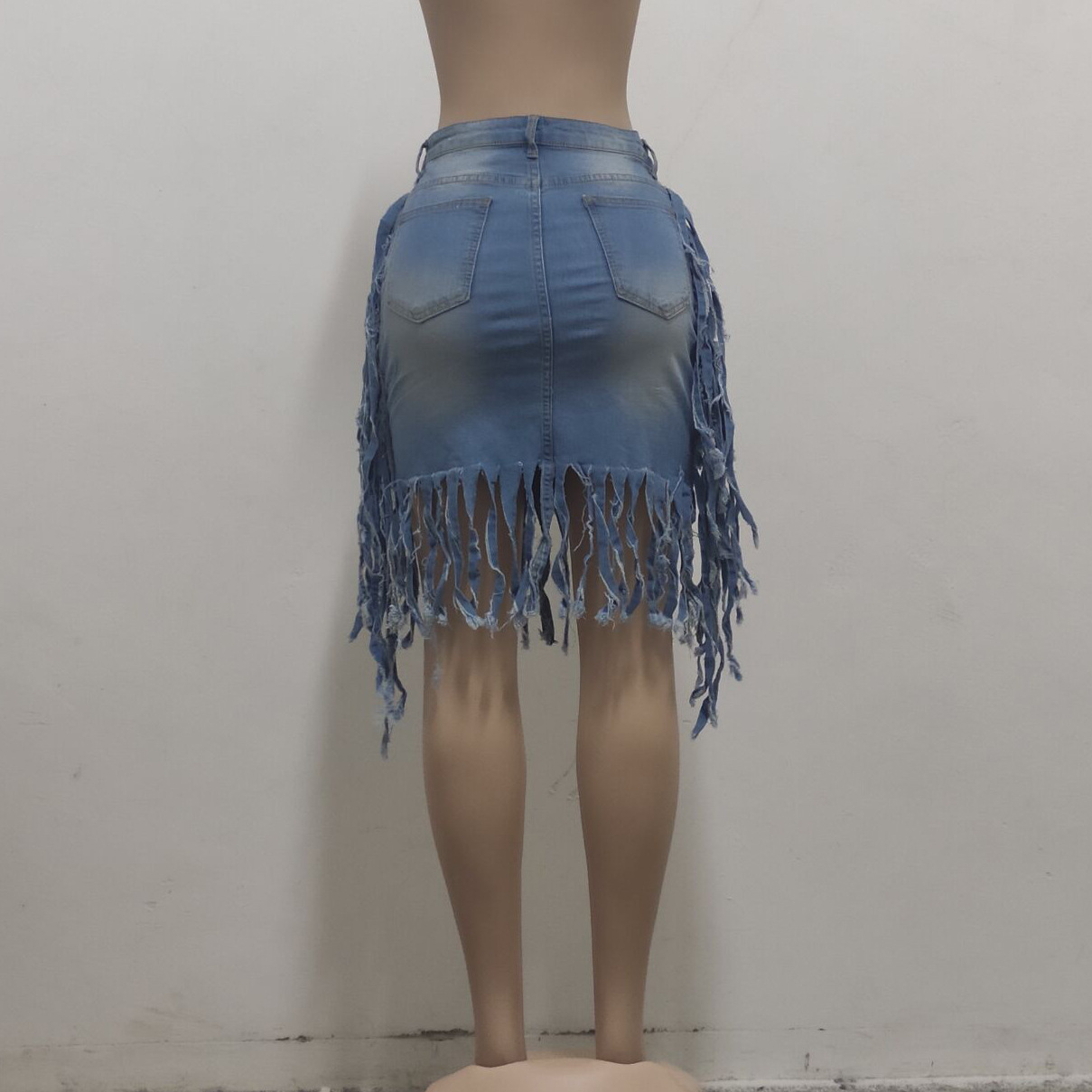 Sexy Washed Denim Tassel High Waist Short Skirt