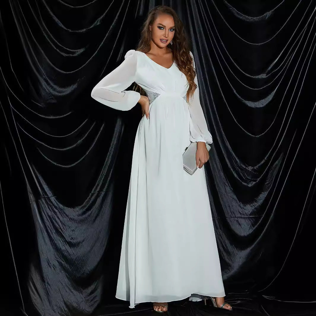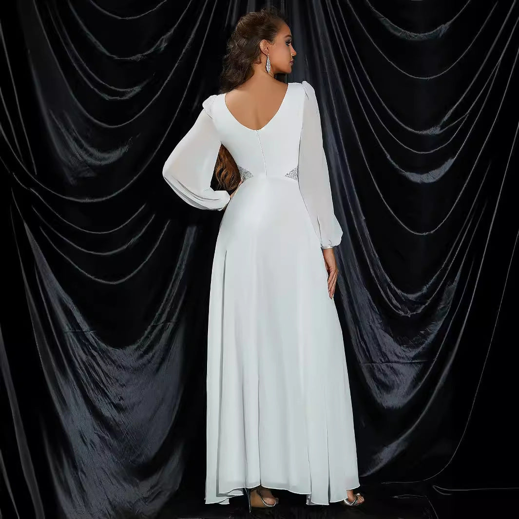 Solid Color Chiffon V neck Long Sleeve Elegant Slim Fit Sequined Cocktail Dress