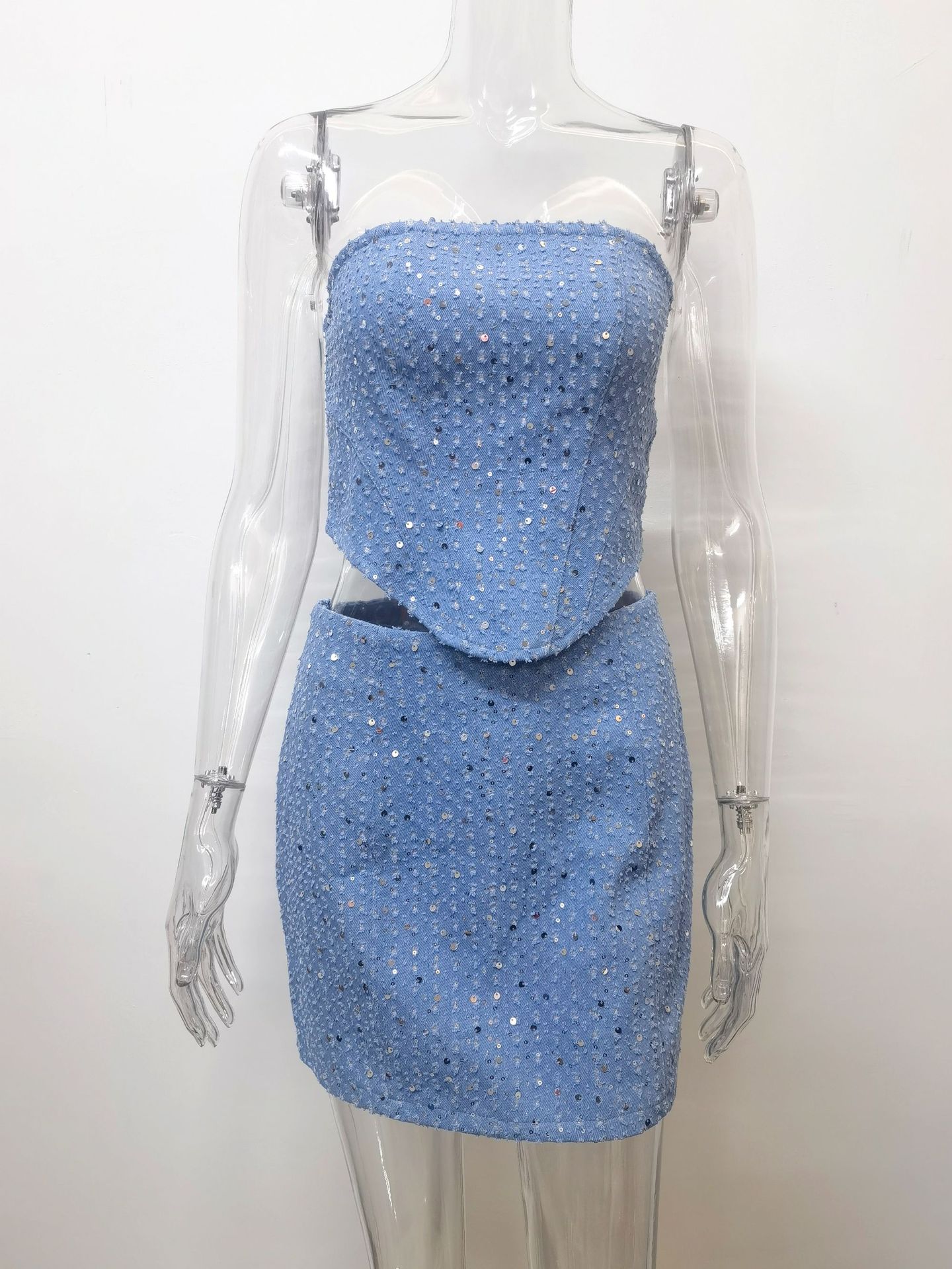Spring Summer Denim With Hole Sequined Tube Top Set