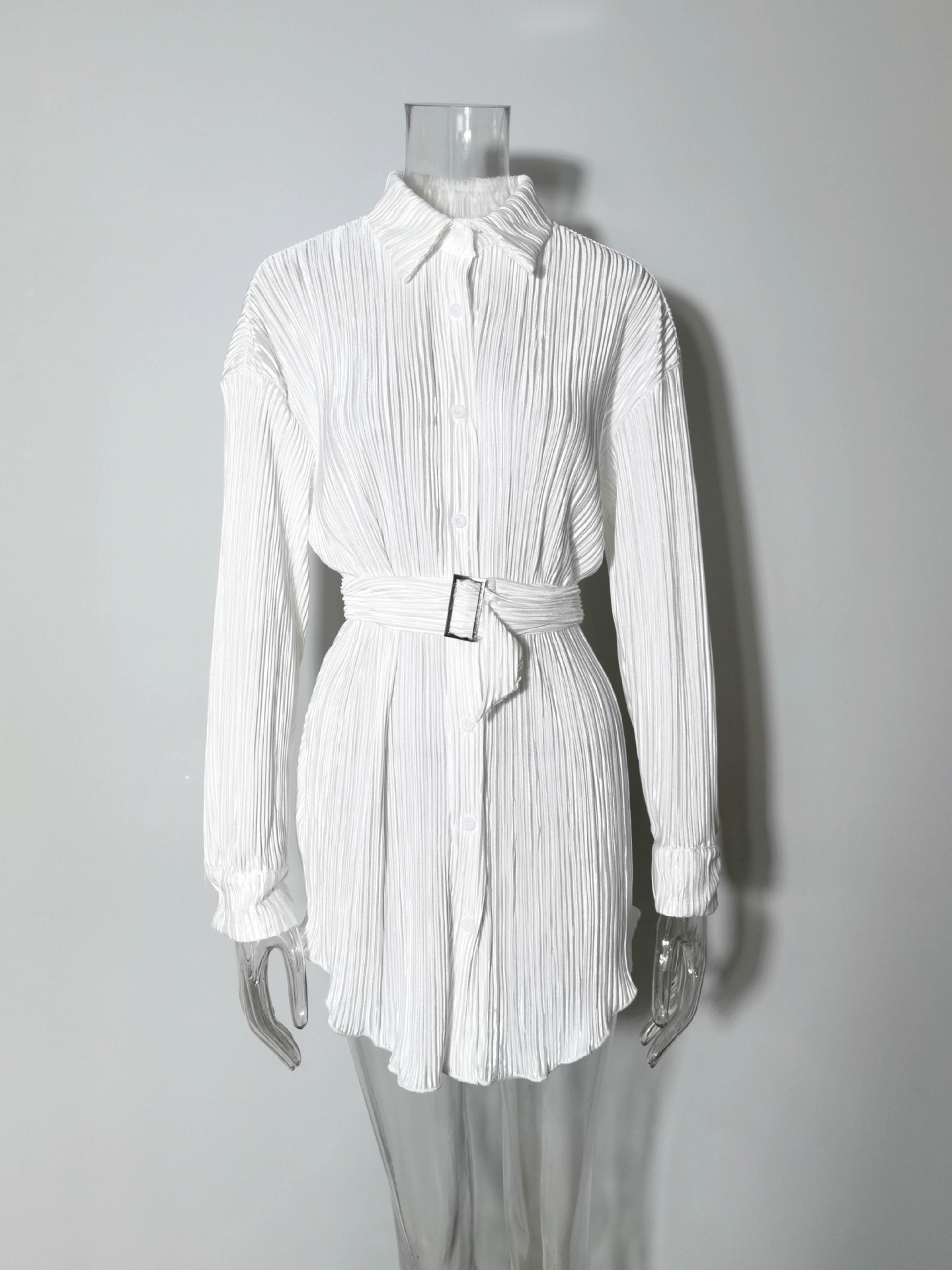Spring Summer Popular Fashionable Pleated Long Sleeved Shirt Belt Dress