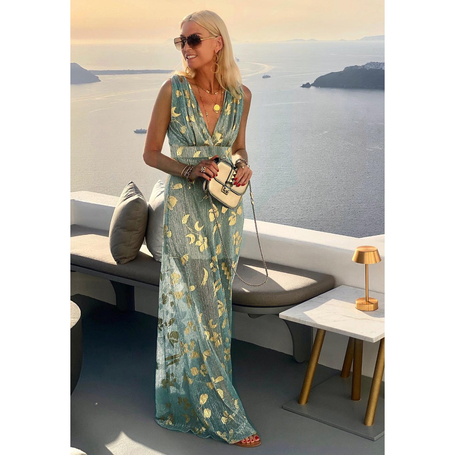 Spring Summer Sexy V Neck Bronzing Dress Casual Holiday Party Women Large Swing Dress