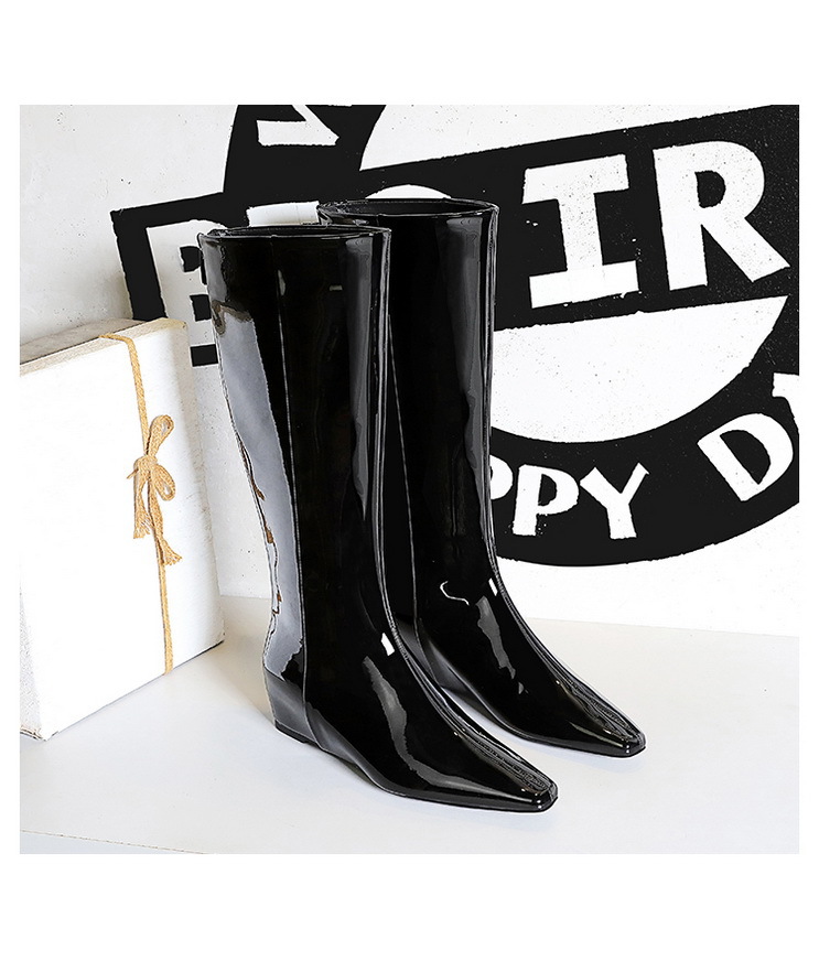 Wide Tube Women Boots Back Zipper Square Toe Middle Heel Wedge Height Increasing ole Shiny Patent Leather High Leg Boot