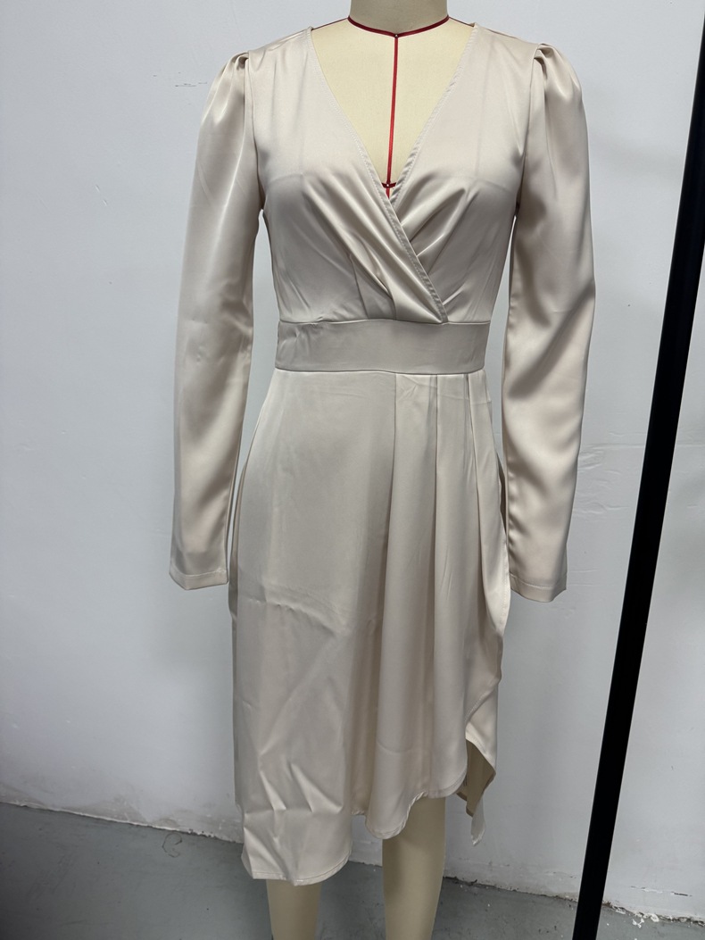 Women Clothing Autumn Satin Dress Waist Trimming Ruffles Satin Dress