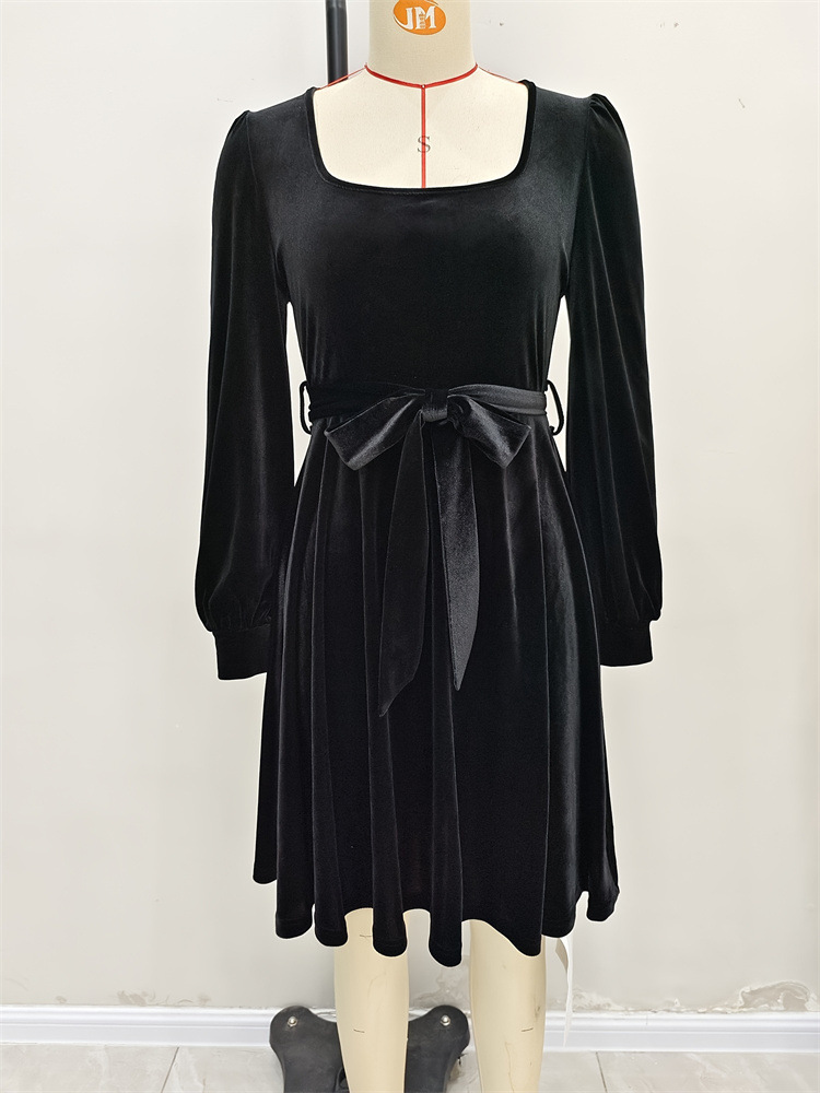 Women Dress Elegant Velvet Square Collar Easy Matching Waisted Slim Fit Stretch Long Sleeve Short Dress