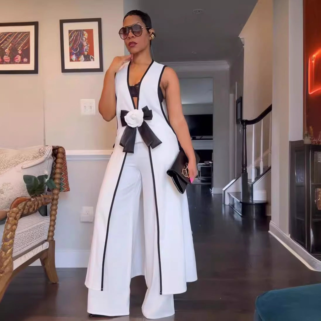 Women Sexy Camellia Bow Sleeveless Long Vest Wide Leg Pants Set