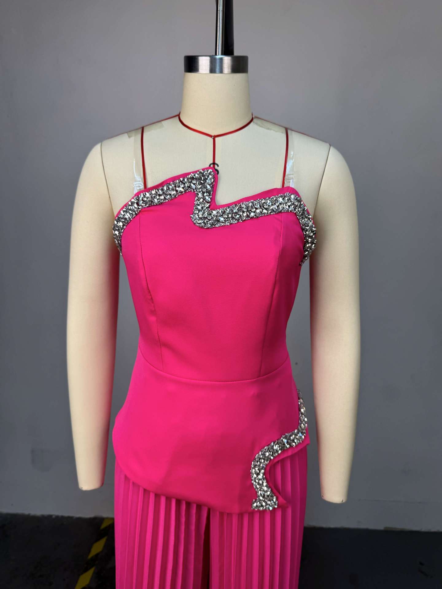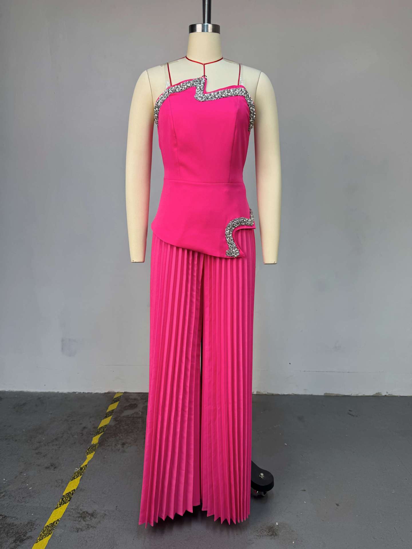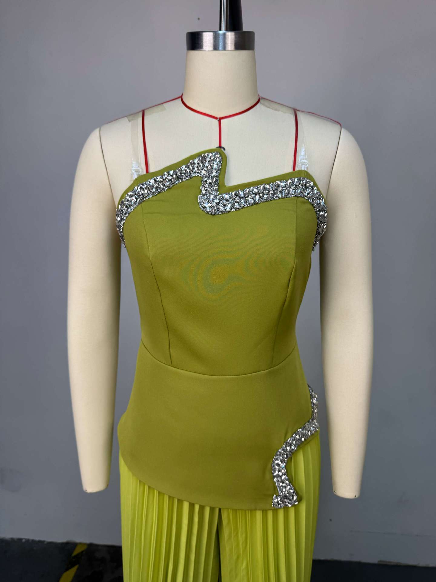 Women Summer Heavy Industry Tube Top with Diamond Irregular Asymmetric Top Pleated Wide Leg Trousers Set