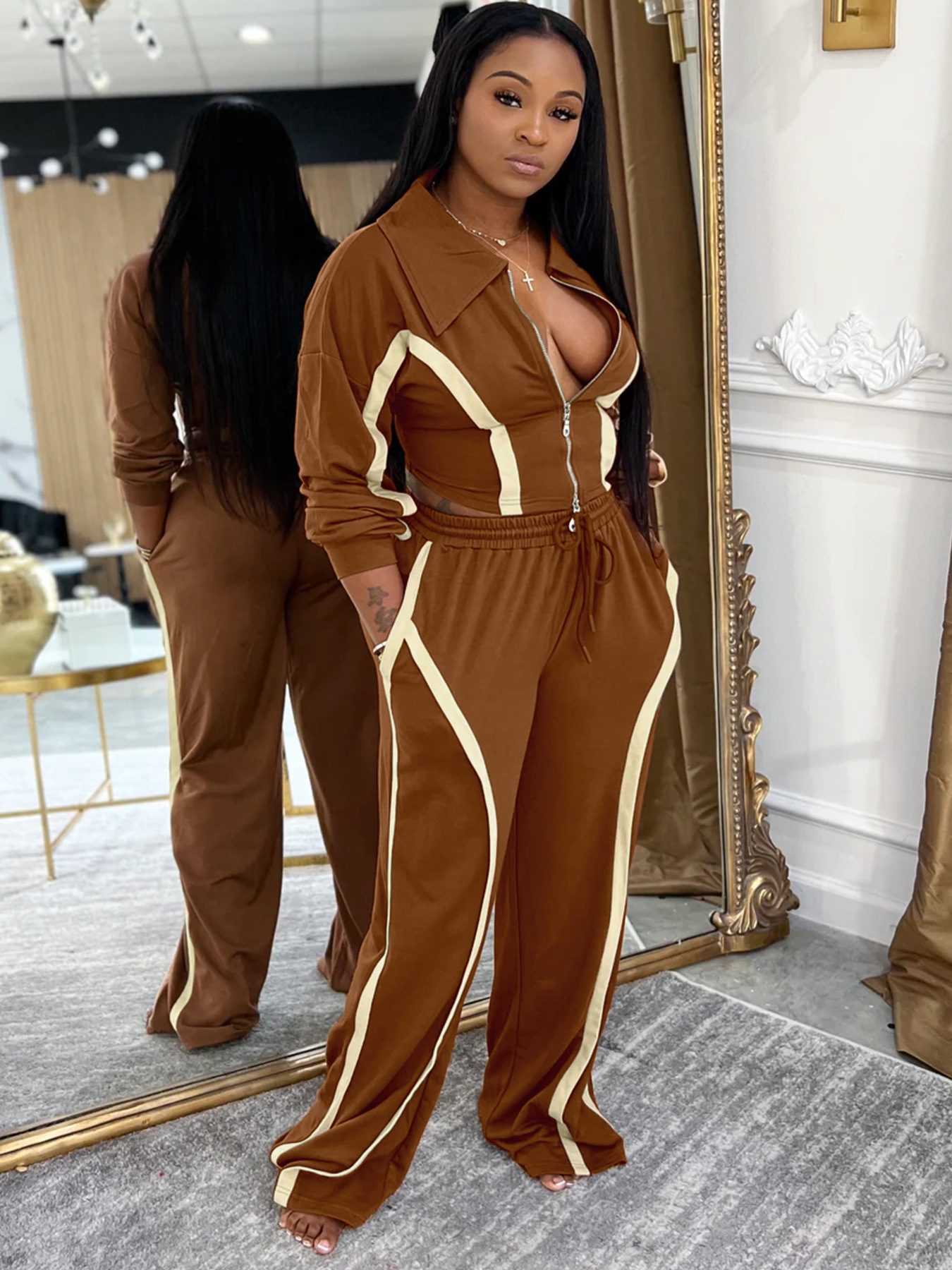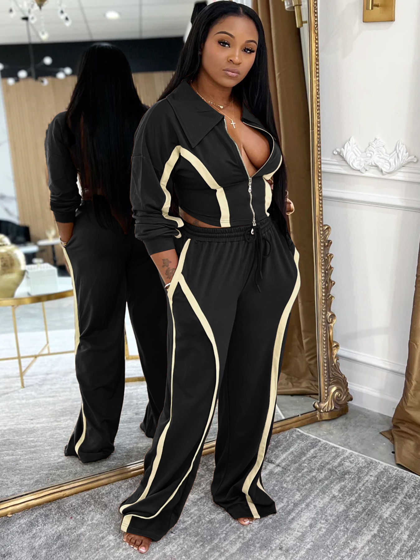 Women Wear Striped Stitching Contrast Color Zipper Polo Collar Top Wide Leg Trousers Two Piece Sets