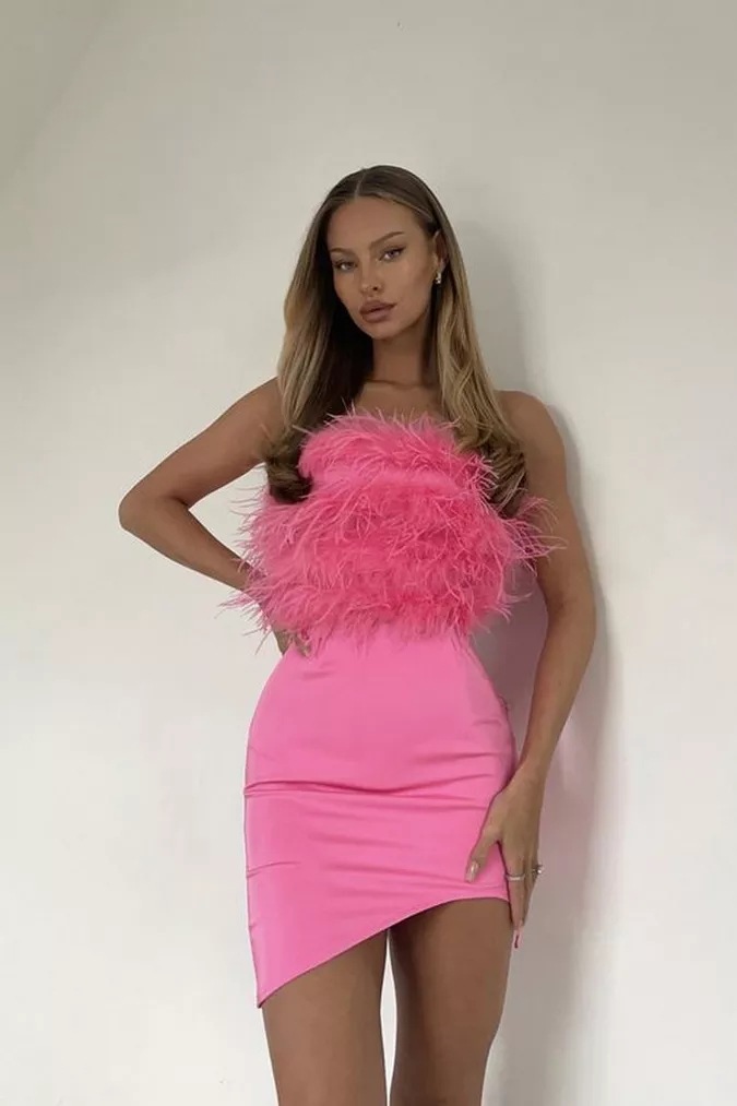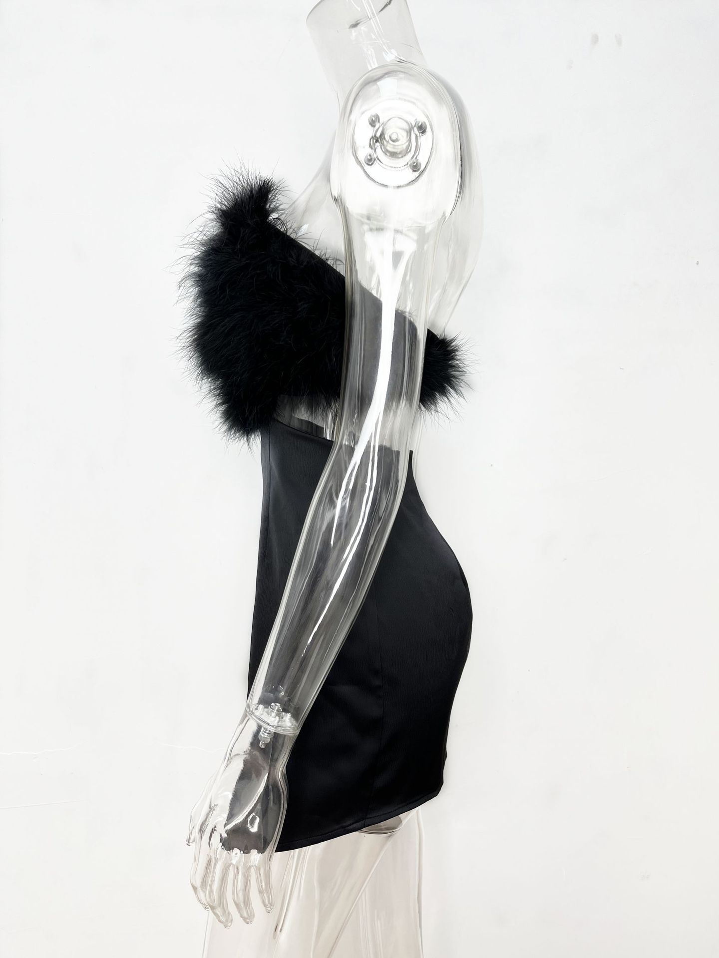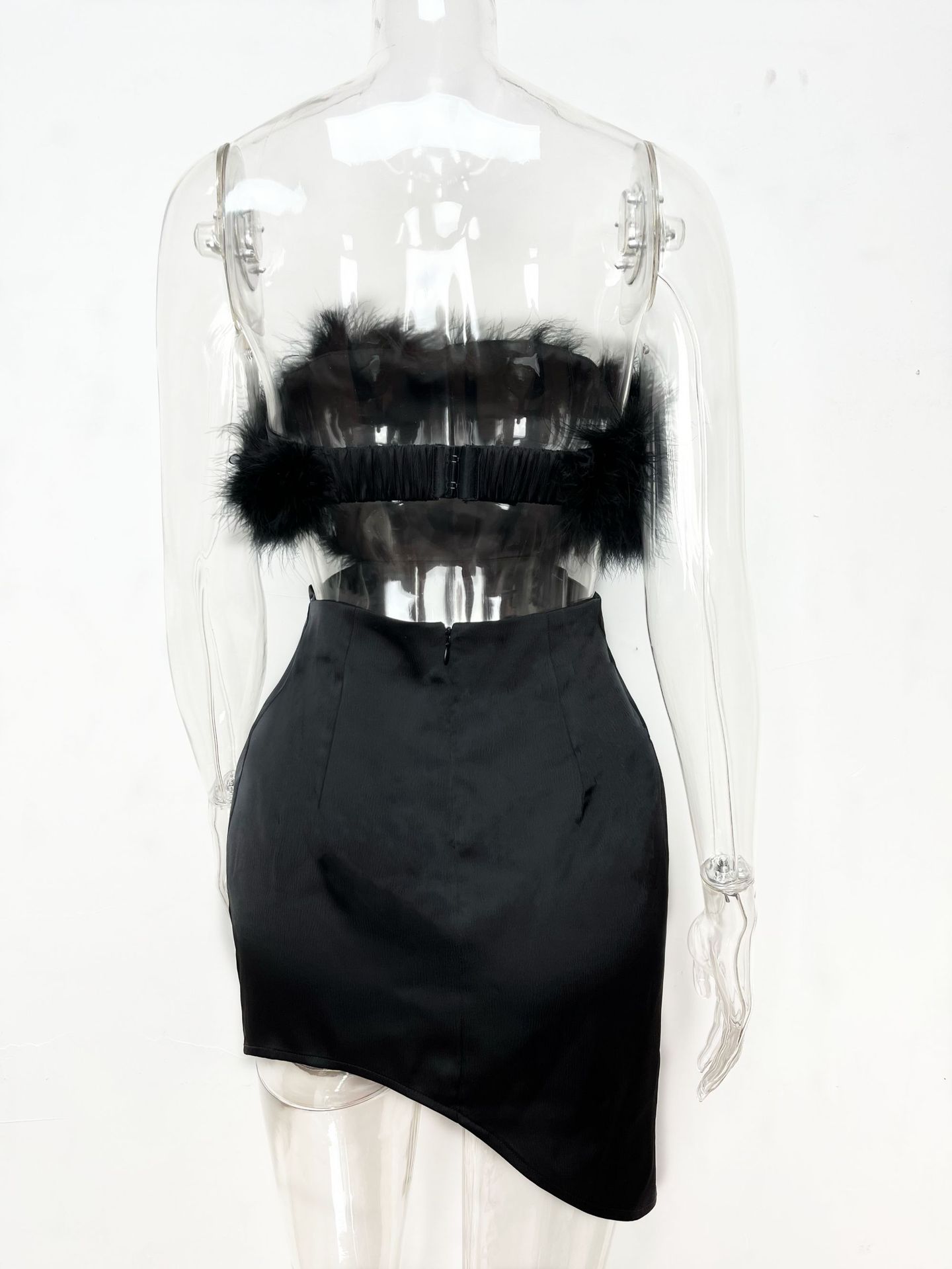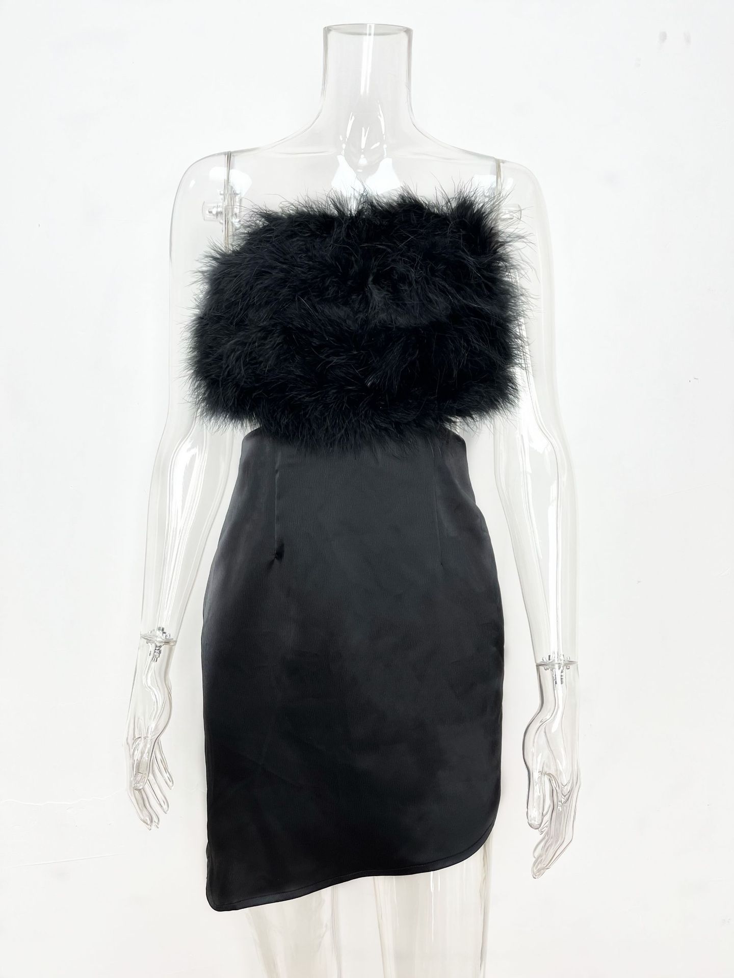 Autumn Winter Backless Dress Feather Tube Top Sexy Irregular Asymmetric Swing Dress