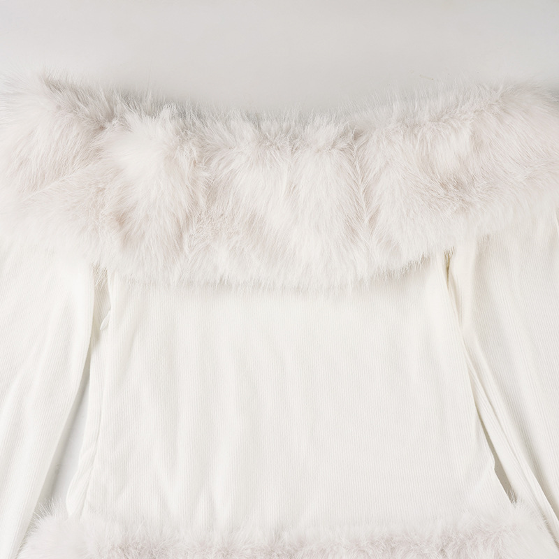 Autumn Winter Elegant Women Party Furry Stitching off Shoulder Dress Sexy Slim Long Sleeve Hip Dress