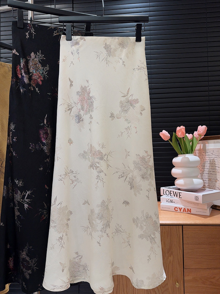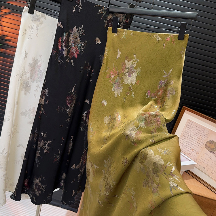 Chinese Long Skirt Advanced Satin Printed Fishtail Skirt Women Summer Sheath Split Chinese A Line Skirt