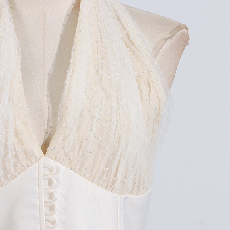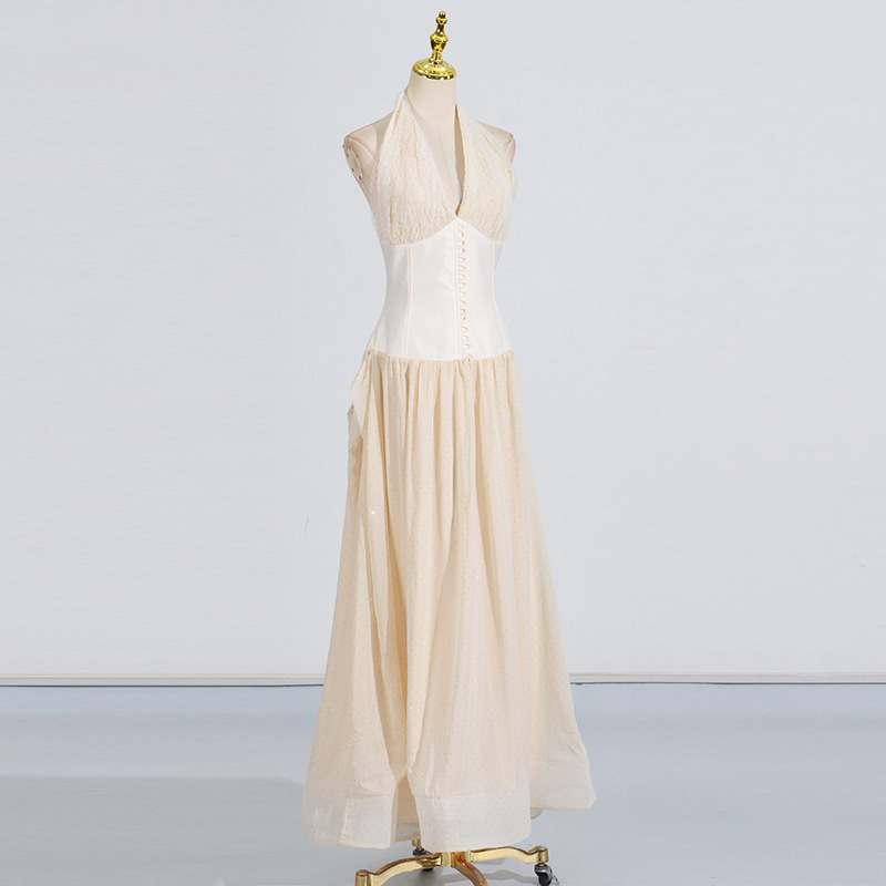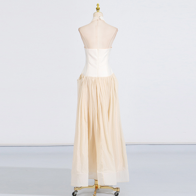 Elegant Maxi Dress Summer Embroidery Hollow Out Cutout out Mesh Stitching Waist Hanging Neck Dress