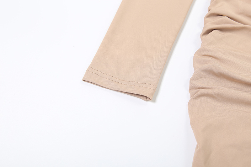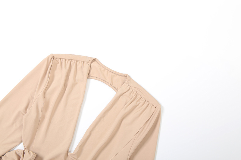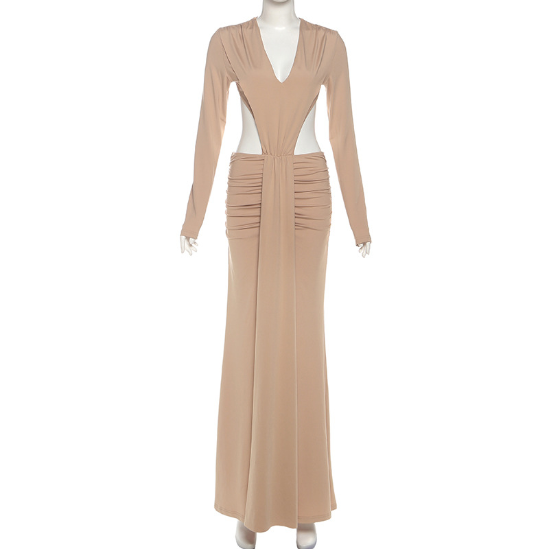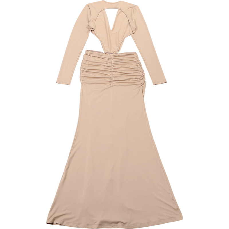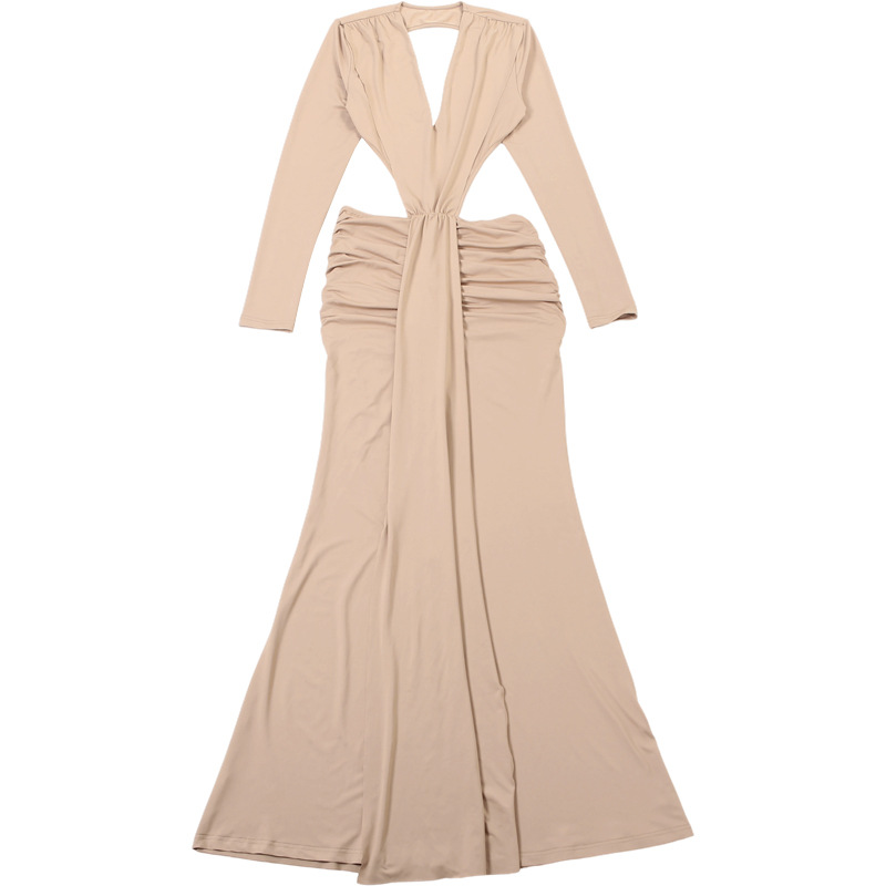 Fall Women Clothing Solid Color V-neck Sexy Backless Long Sleeves Split Pleated Dress