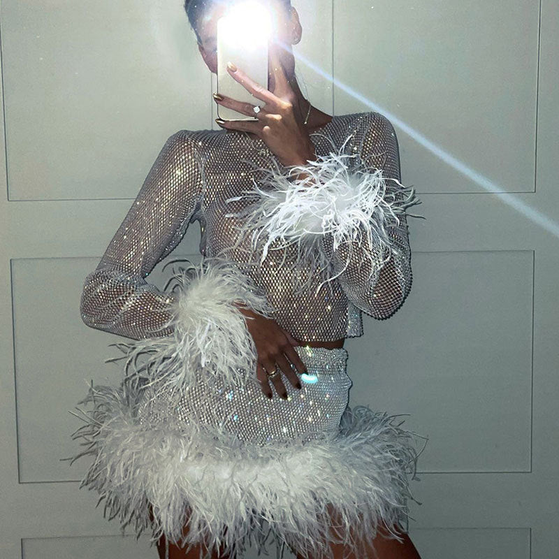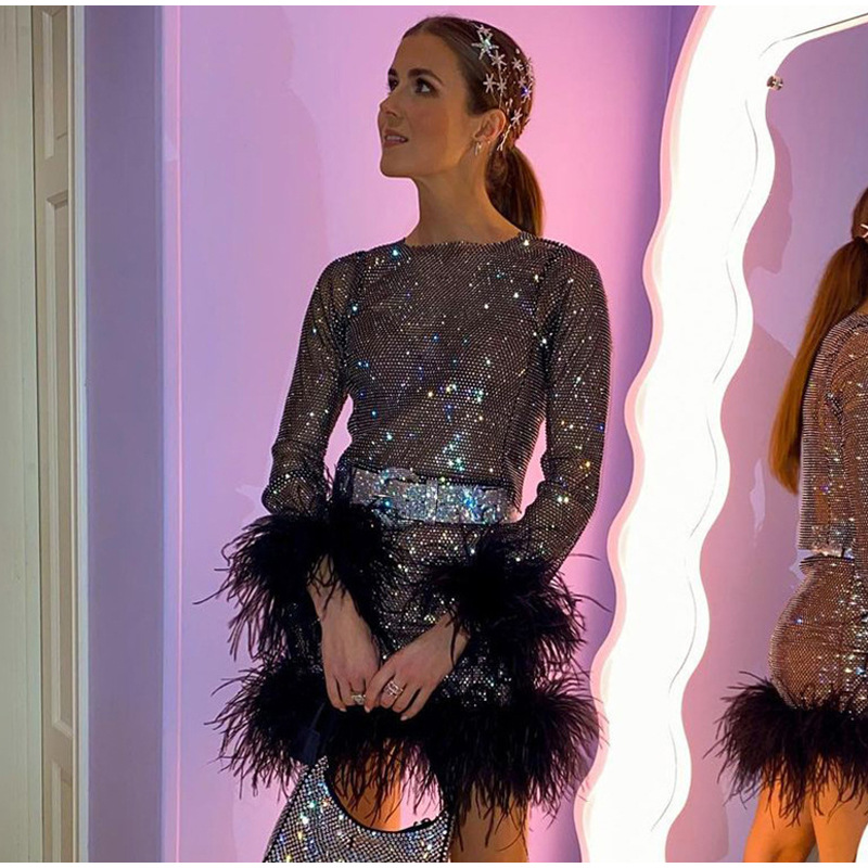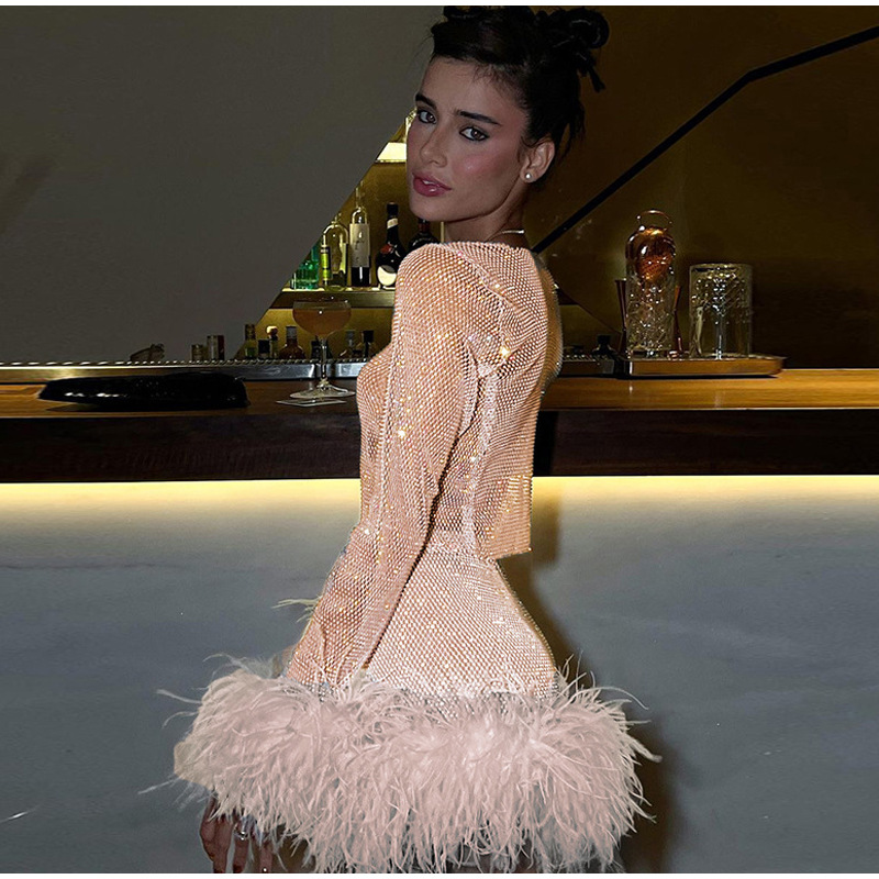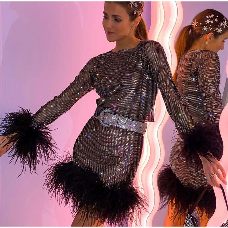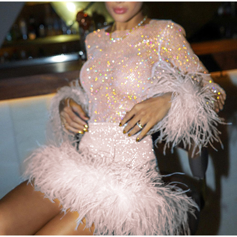 Fashionable Sequ Furry Skirt Set Women Sexy Nightclub Women round Neck Sexy Long Sleeve Short Dress