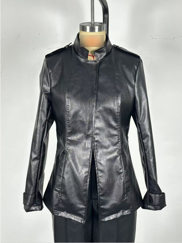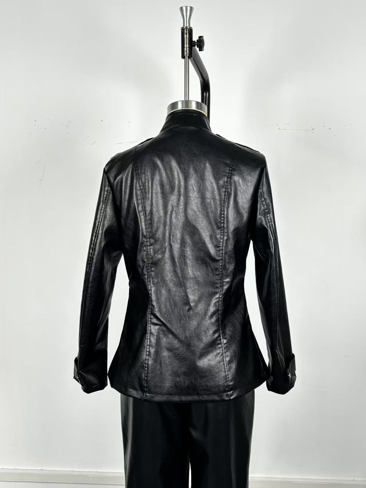 Ladies Leather Stand Collar Long Sleeve Distressed Trendy Gothic Faux Leather Jacket
