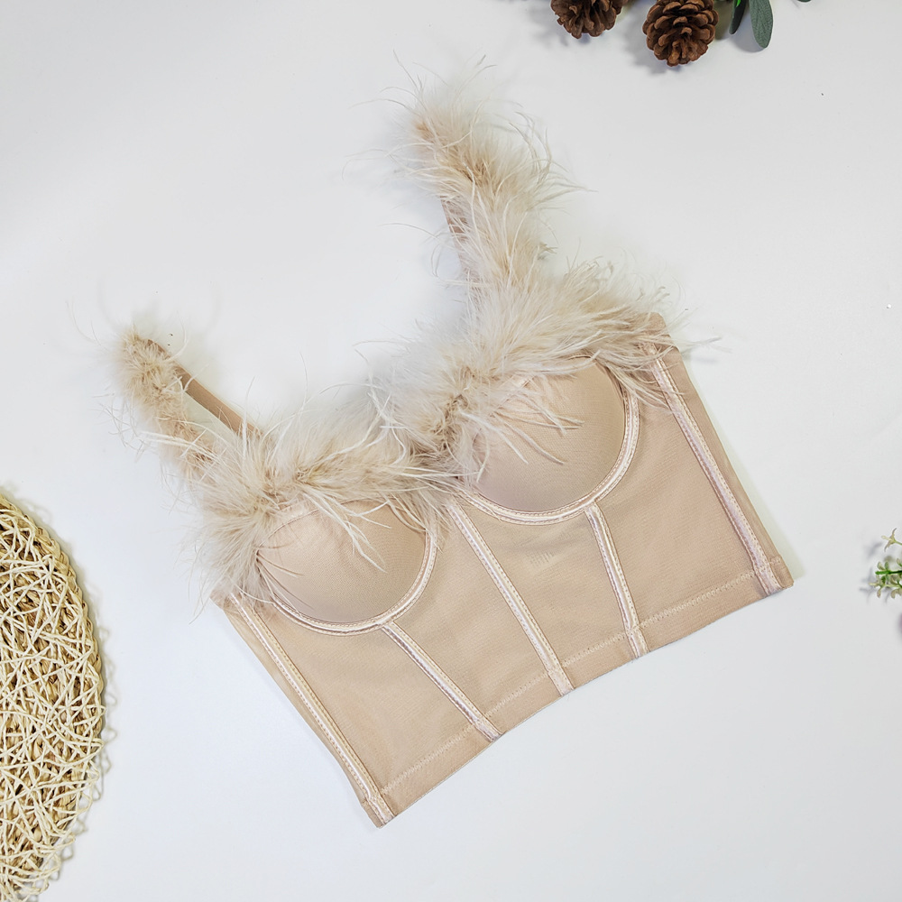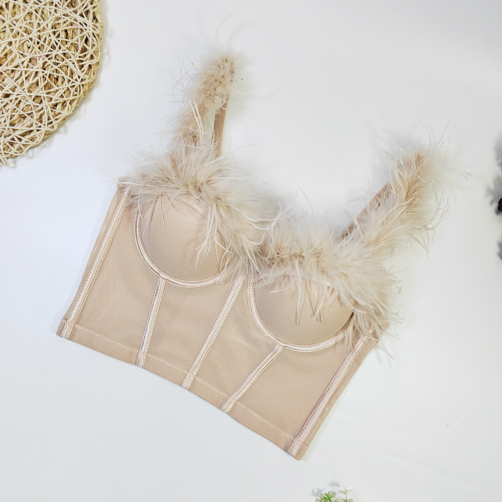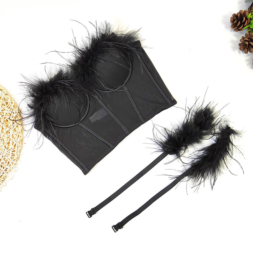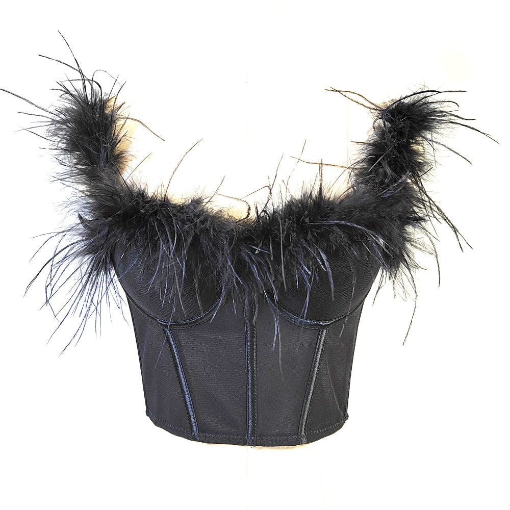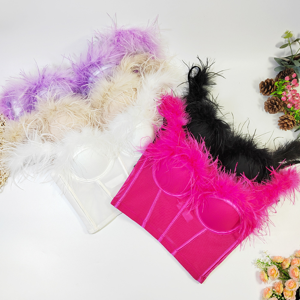 Live Broadcast High Grade Ostrich Fur Super Fairy Boning Corset Tube Top Shaping Drawstring Slim Fit Bare Back Feather Sling