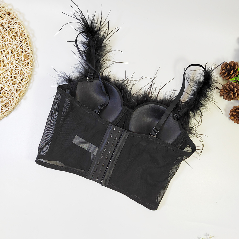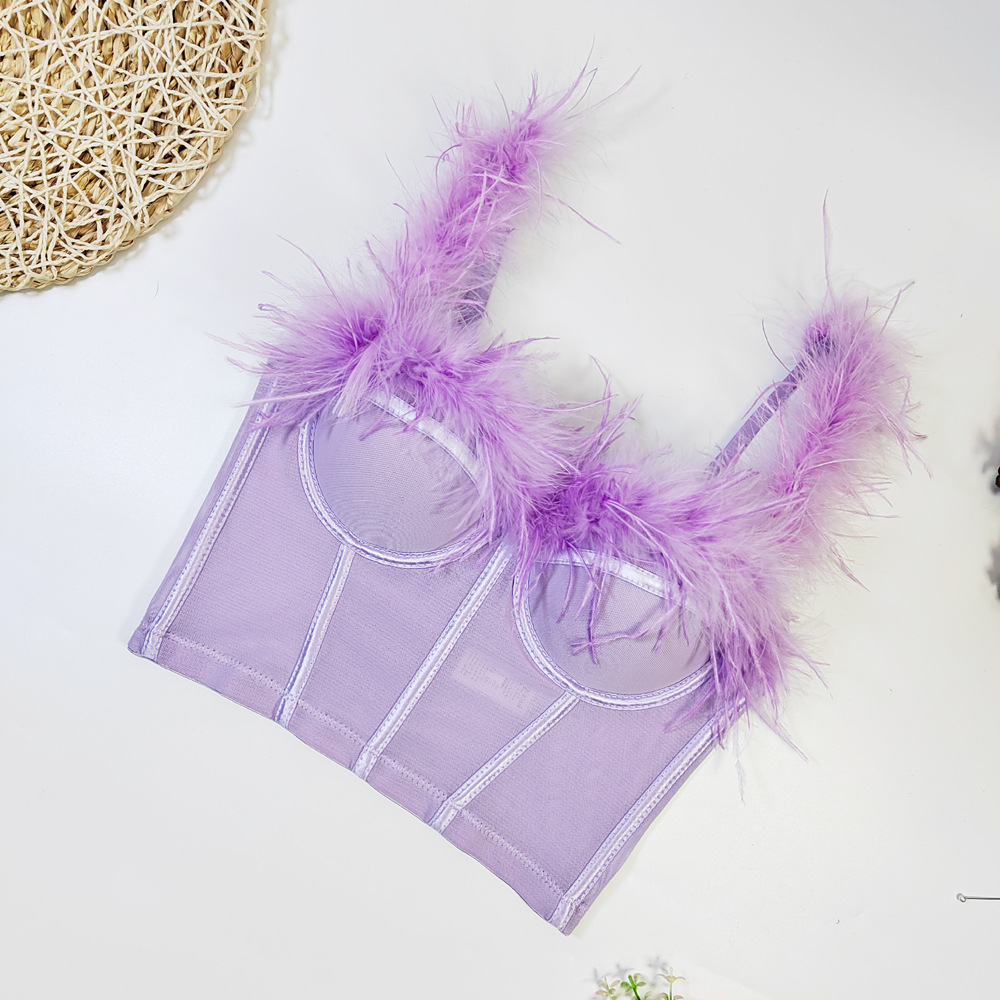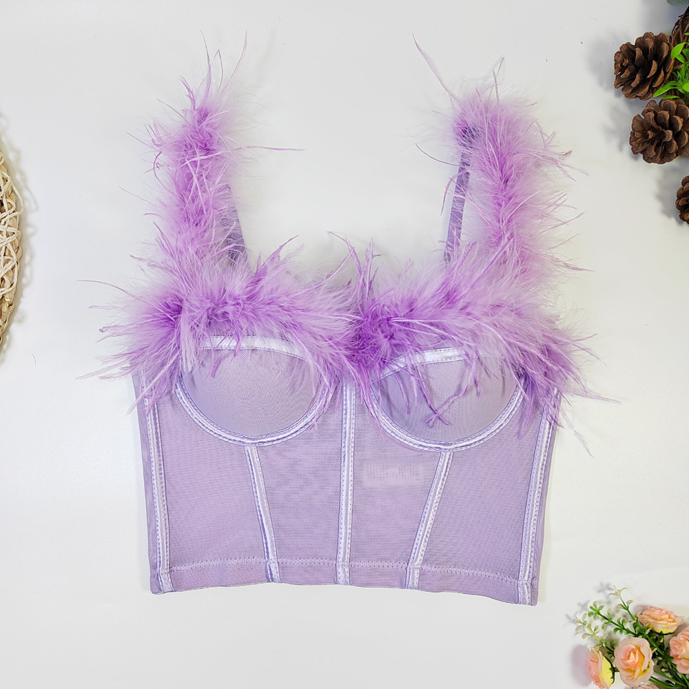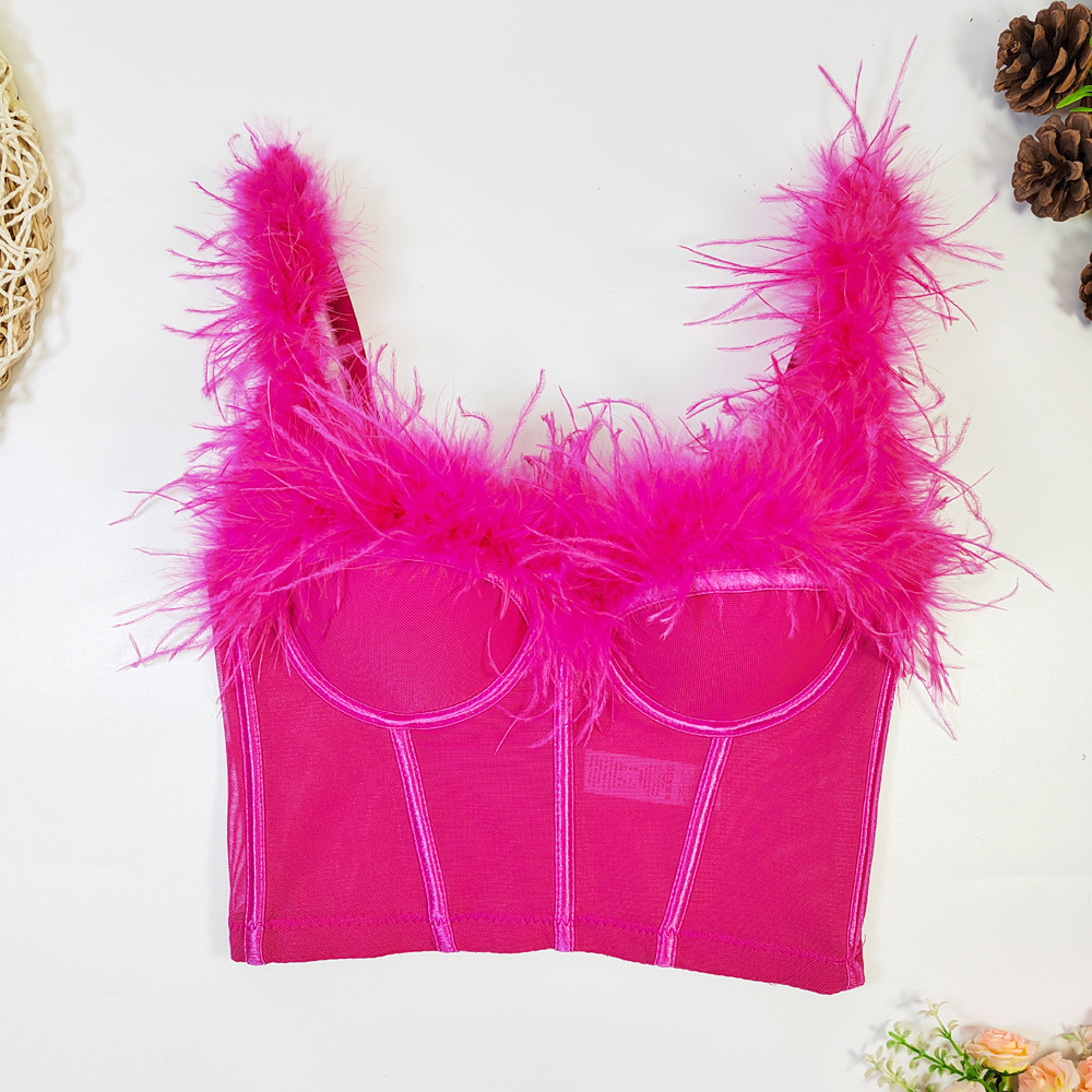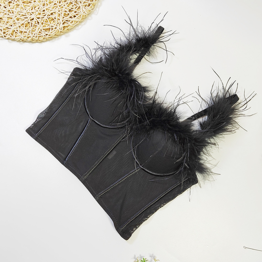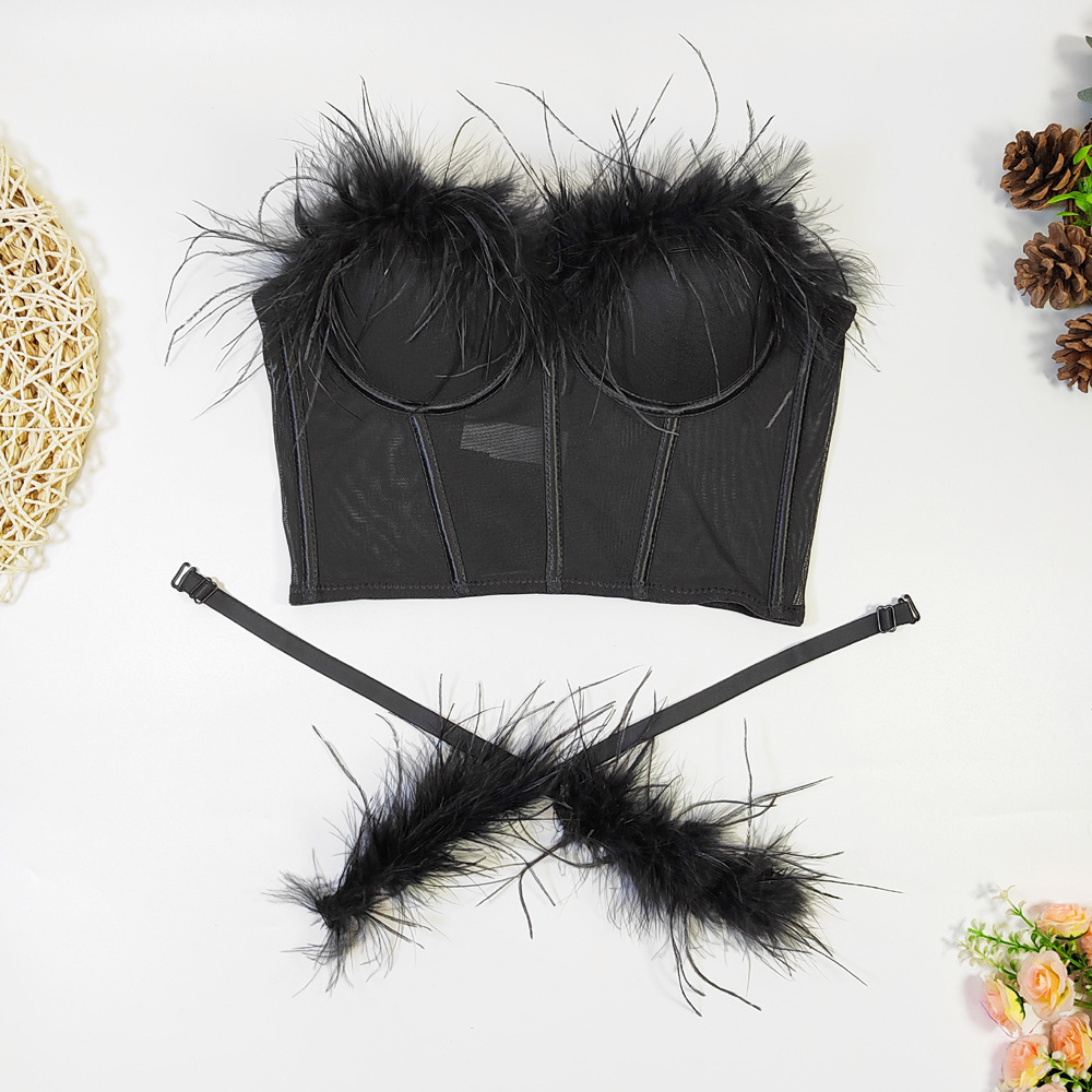 Live Broadcast High Grade Ostrich Fur Super Fairy Boning Corset Tube Top Shaping Drawstring Slim Fit Bare Back Feather Sling