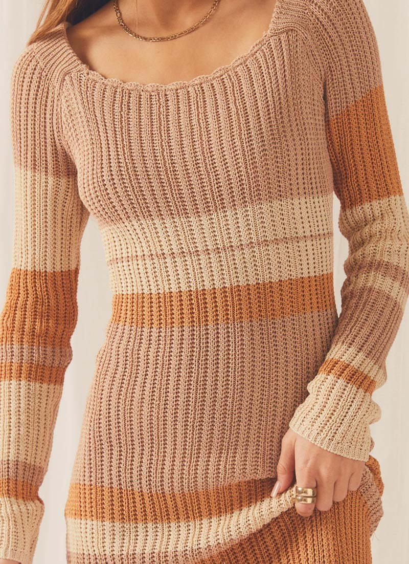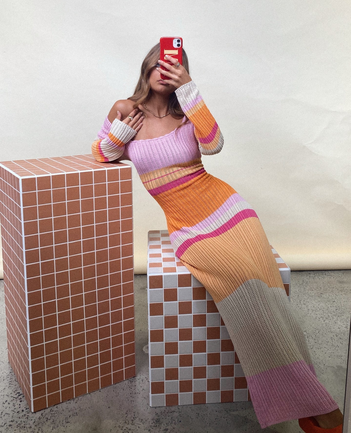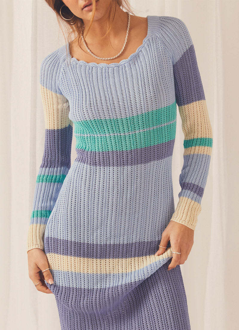 Long Contrast Color Off Neck Off The Shoulder Hollow Out Cutout Out Beach Long Sleeve Knitted Striped Dress Women