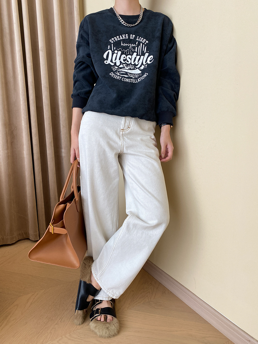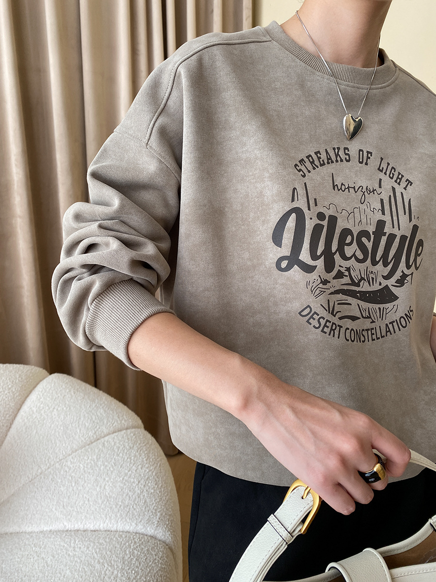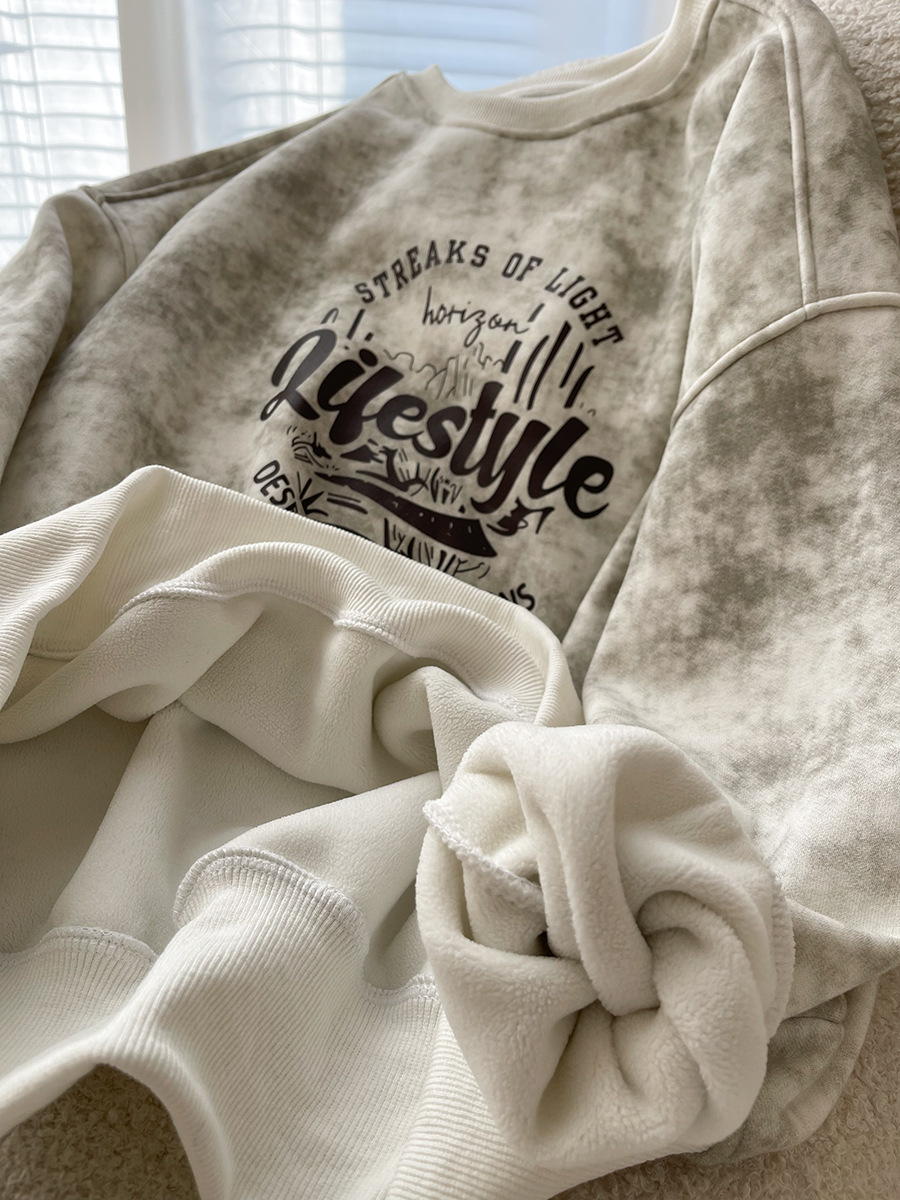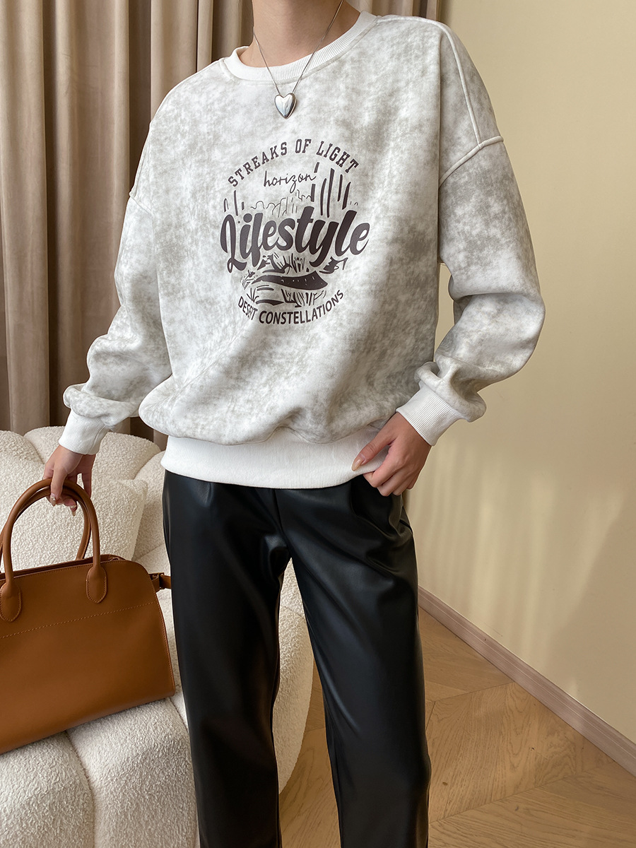 Mottled Tone Casual Letter Graphic Printed Casual round Neck Loose Shoulder Sweatshirt
