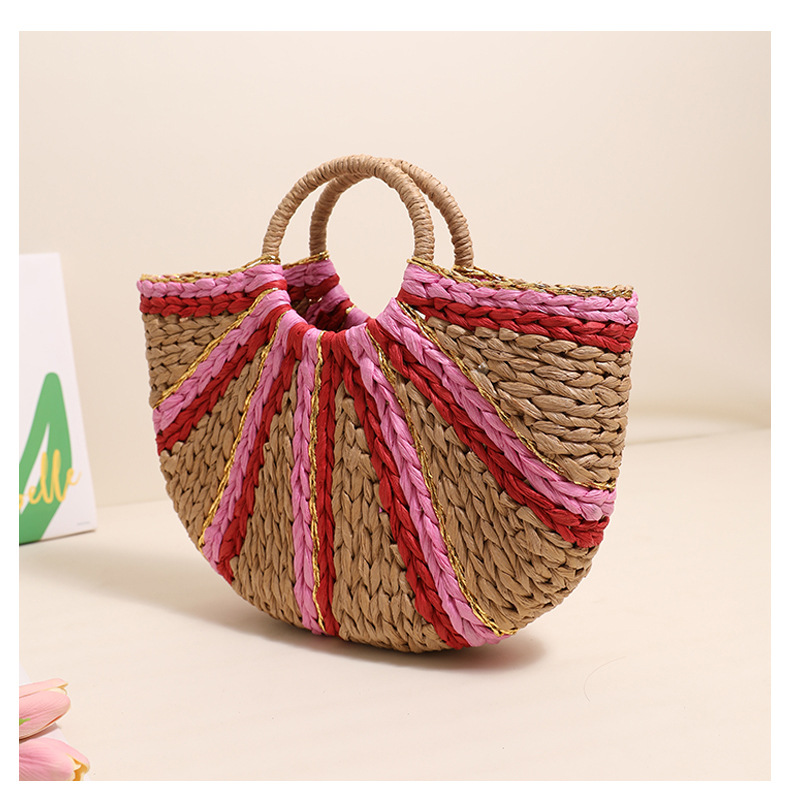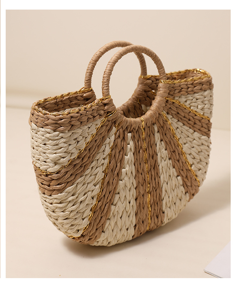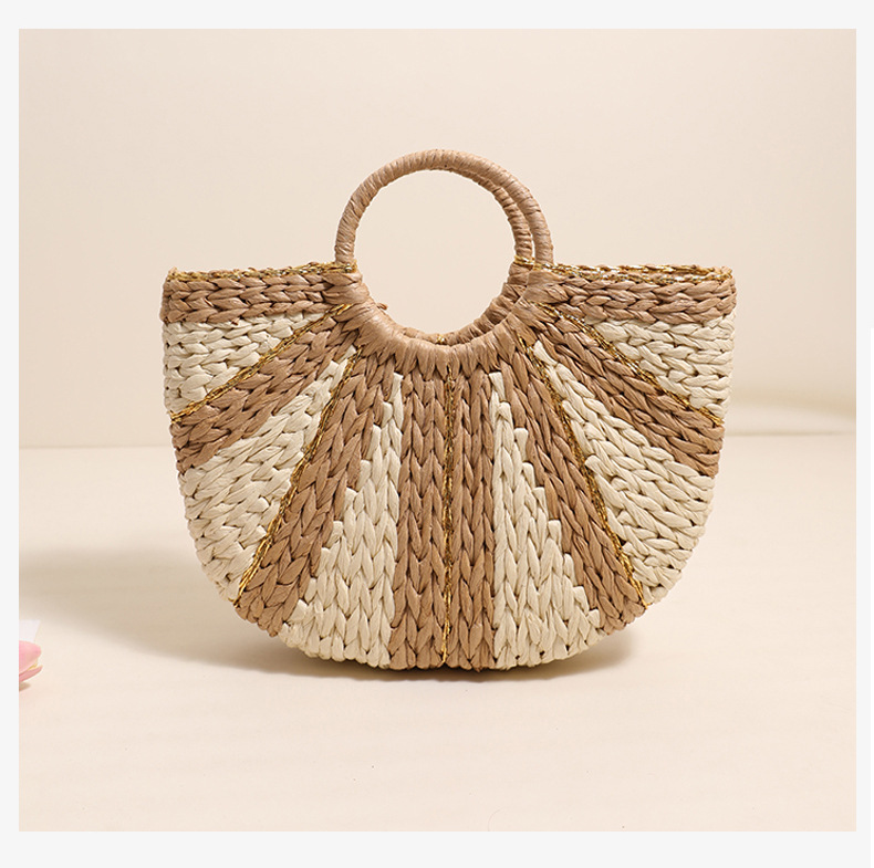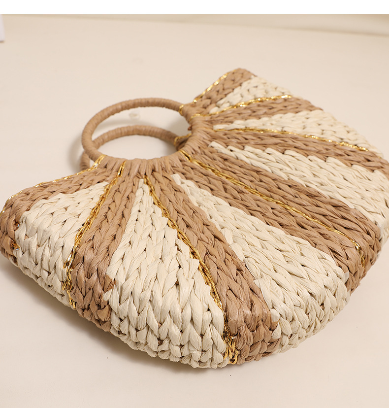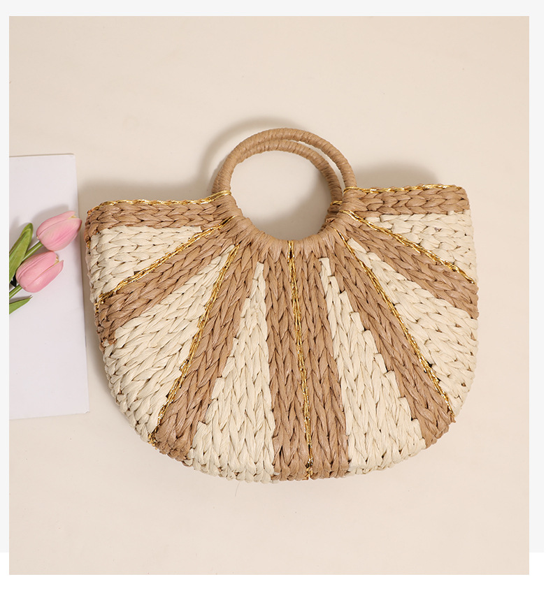 Niche Gold Line Contrast Color Portable Straw-Weaved Bag Striped Semicircle Straw Bag Woven Bag Degrees Wind Faux Beach Bag Women Bag