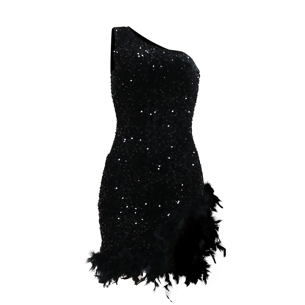 Oblique Shoulder Sequined Feather Dress Sheath Slit Hemline