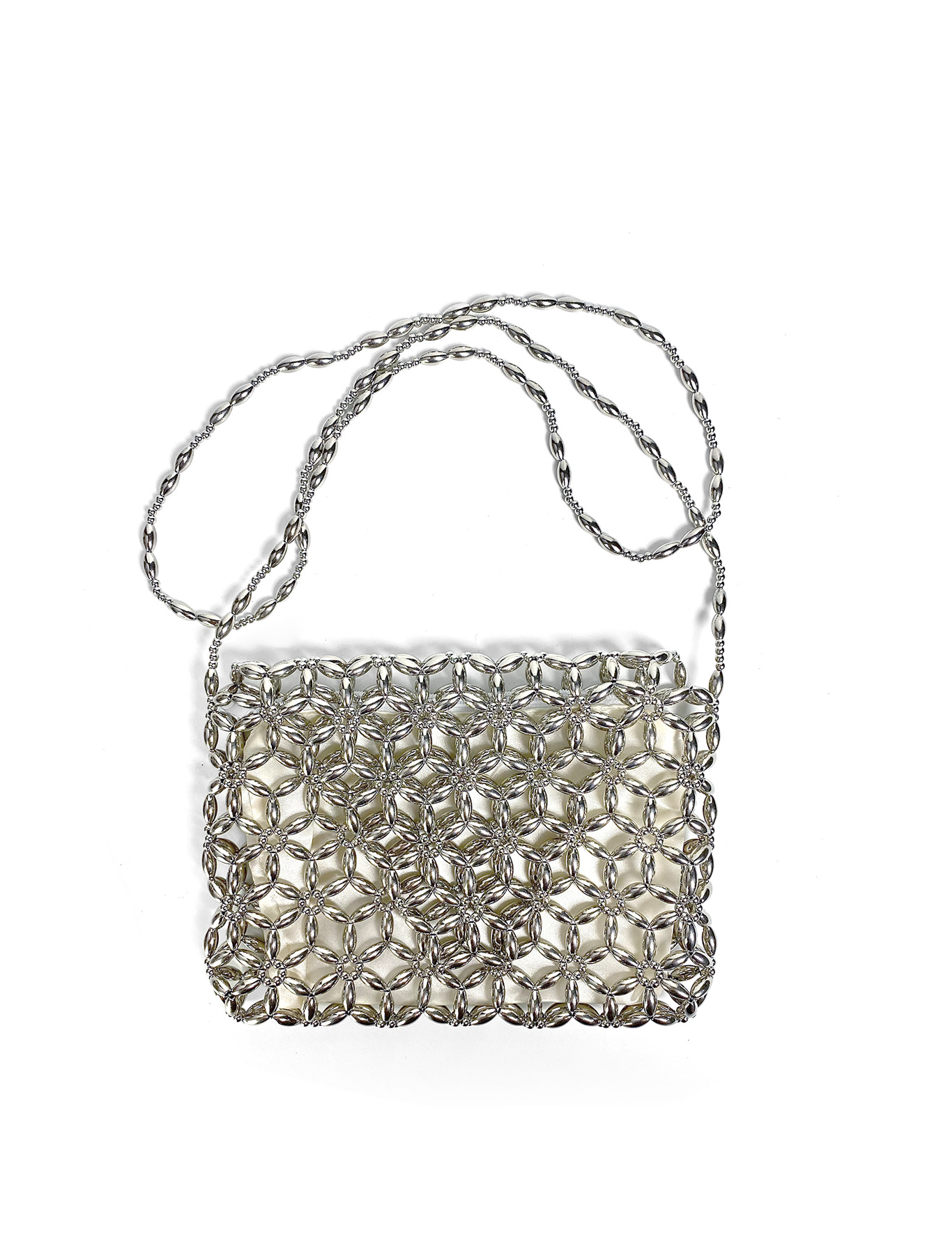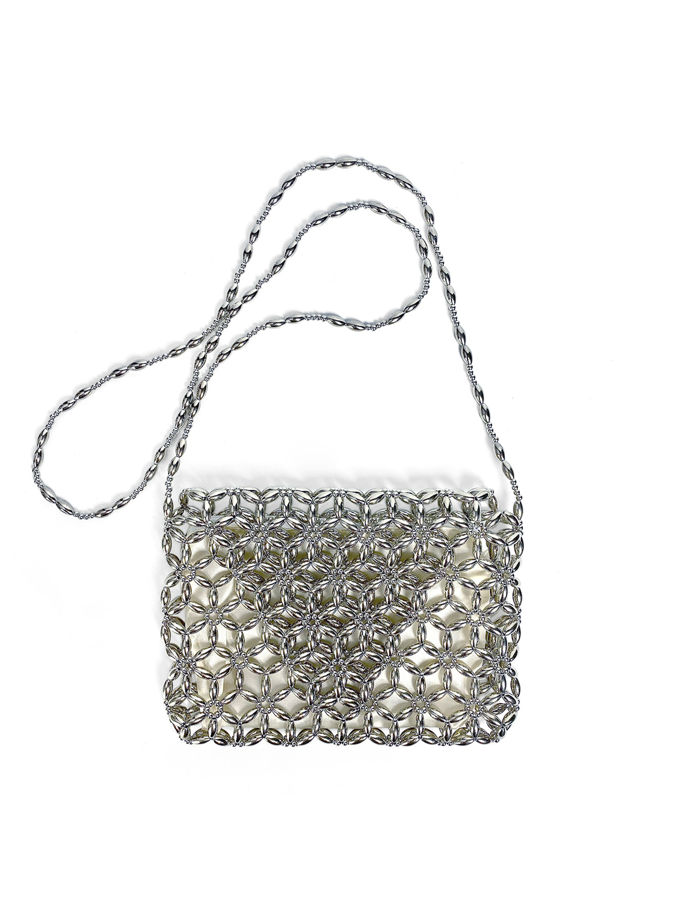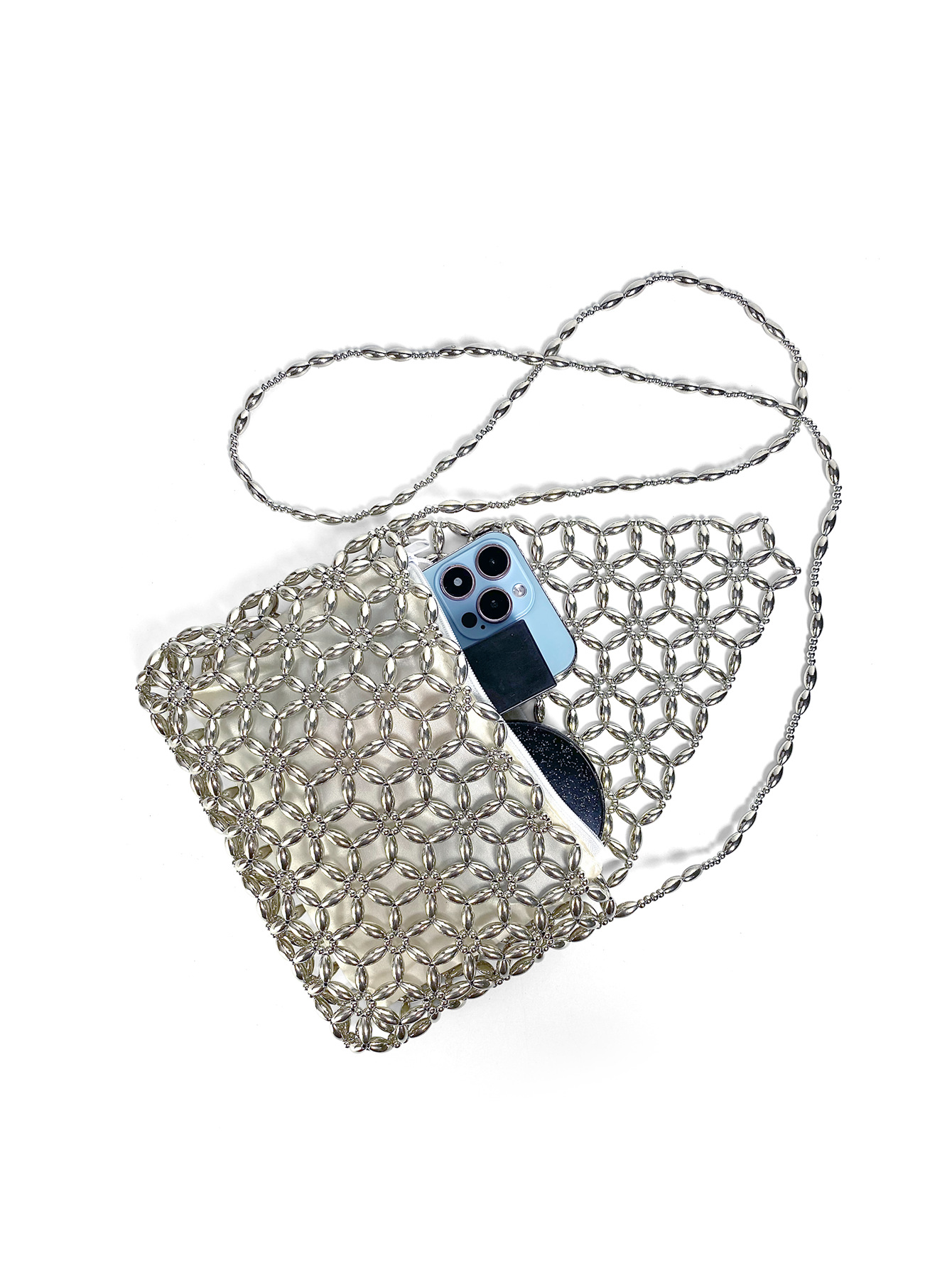 Retro Metal Silver Hand Woven Beads Small Square Bag Long Shoulder Strap Phone Crossbody Bag