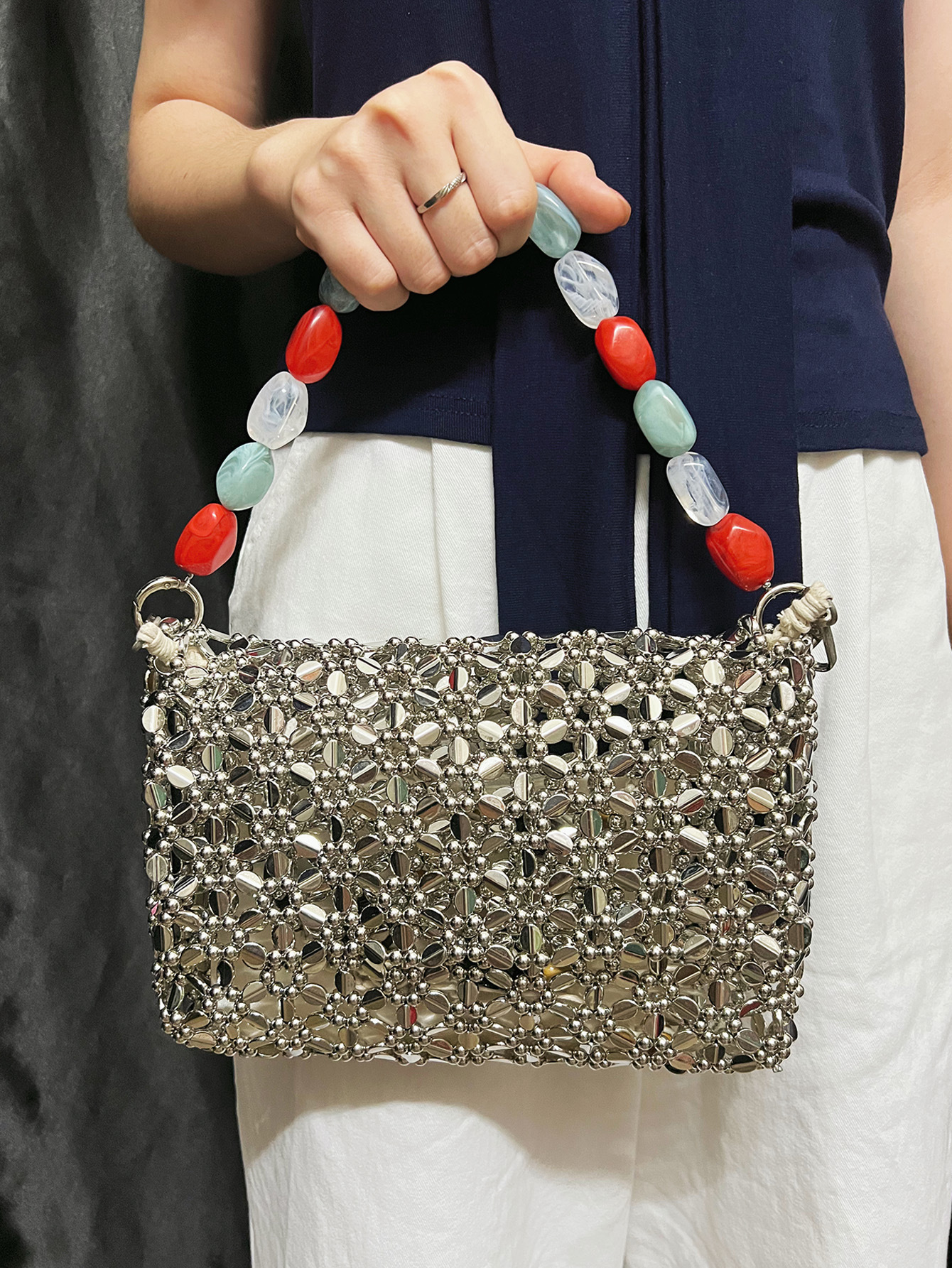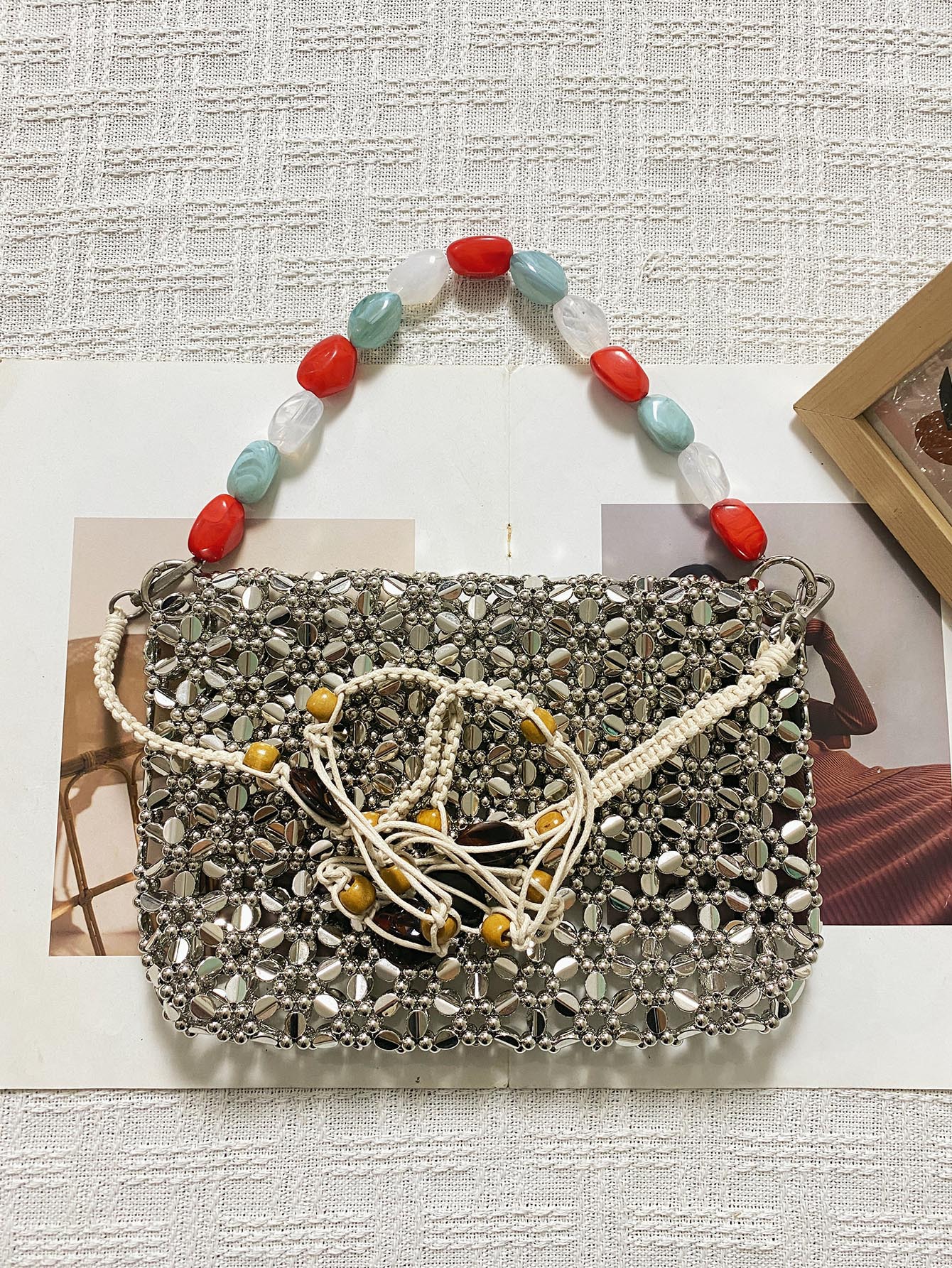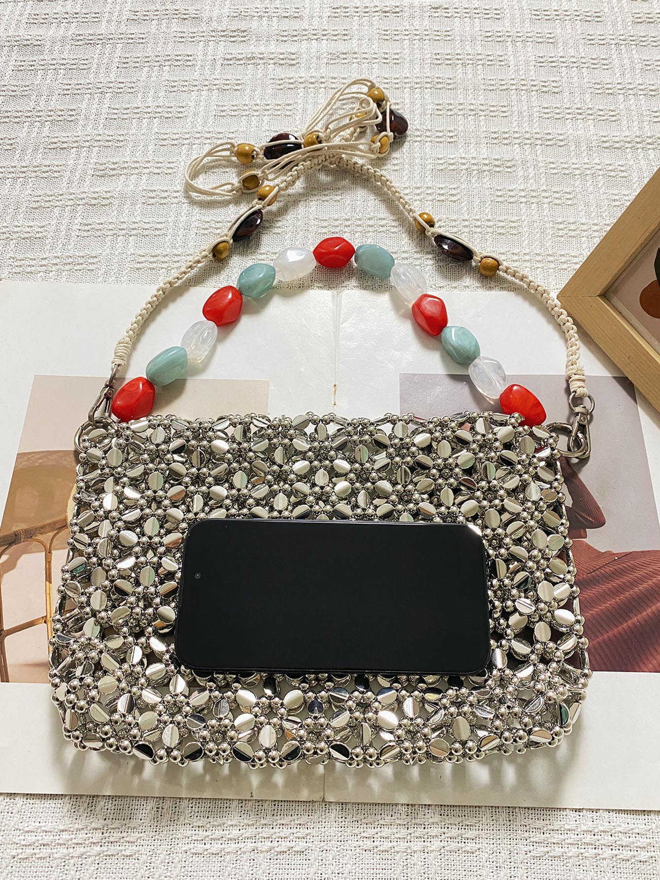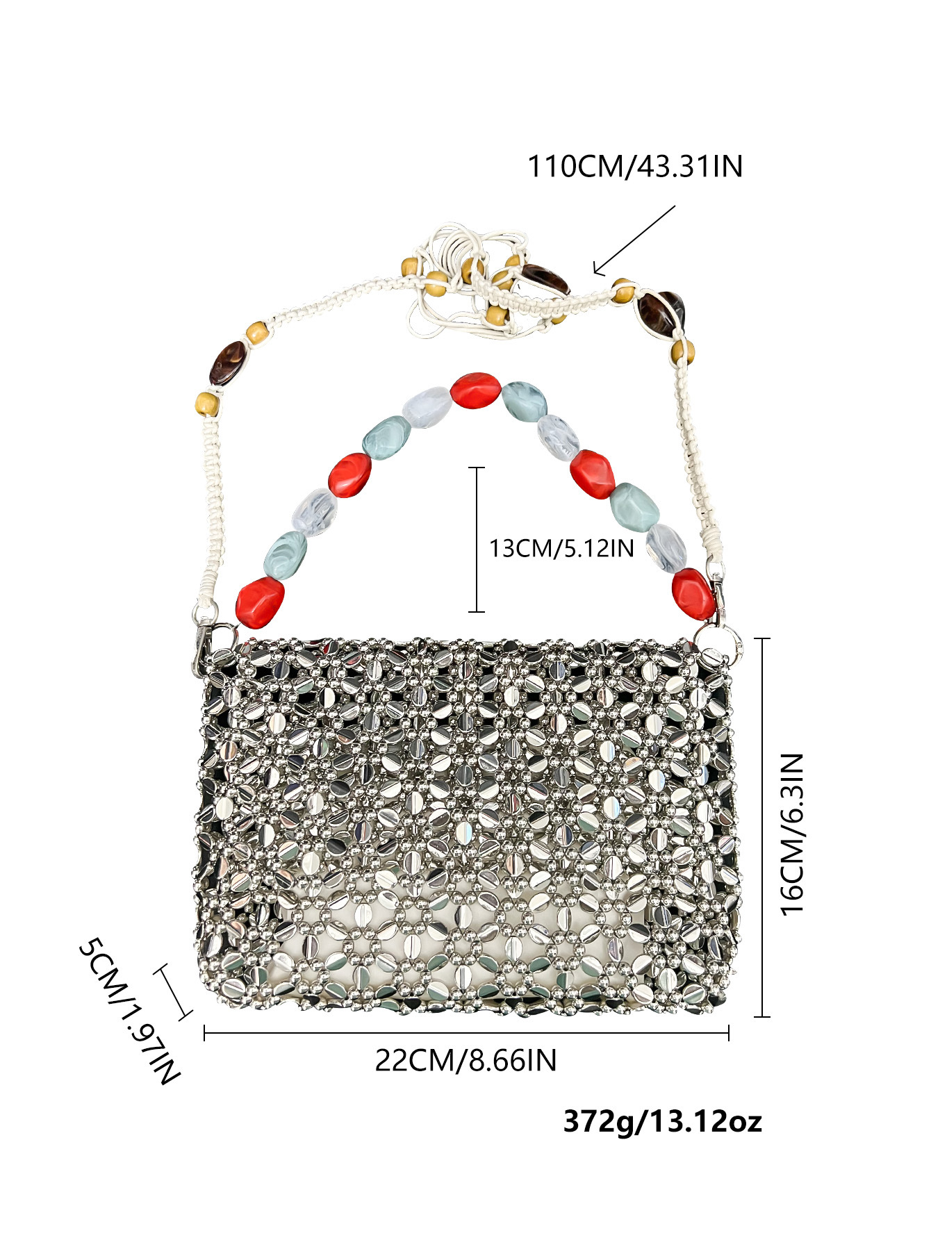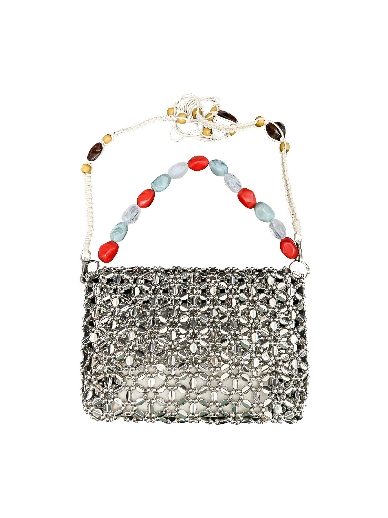 Retro Silver Hand Woven Beads Small Square Bag Long Shoulder Strap Phone Crossbody Bag