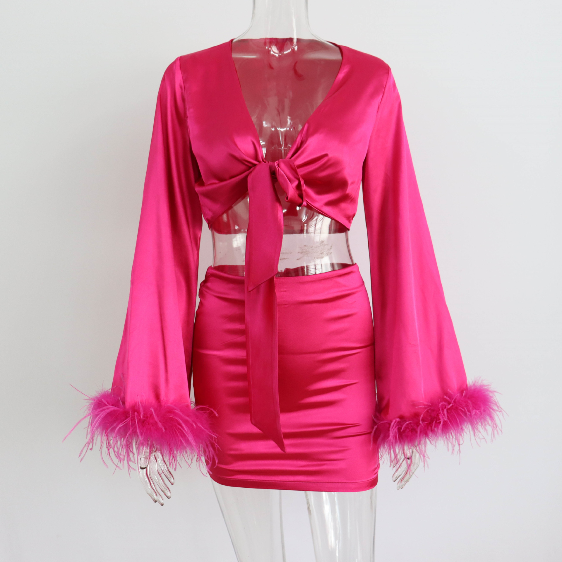 Satin Set Feather V neck Patchwork Sexy Lace up Short Top Hip Skirt Slit Casual Pants