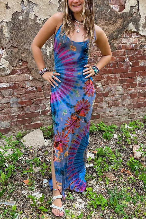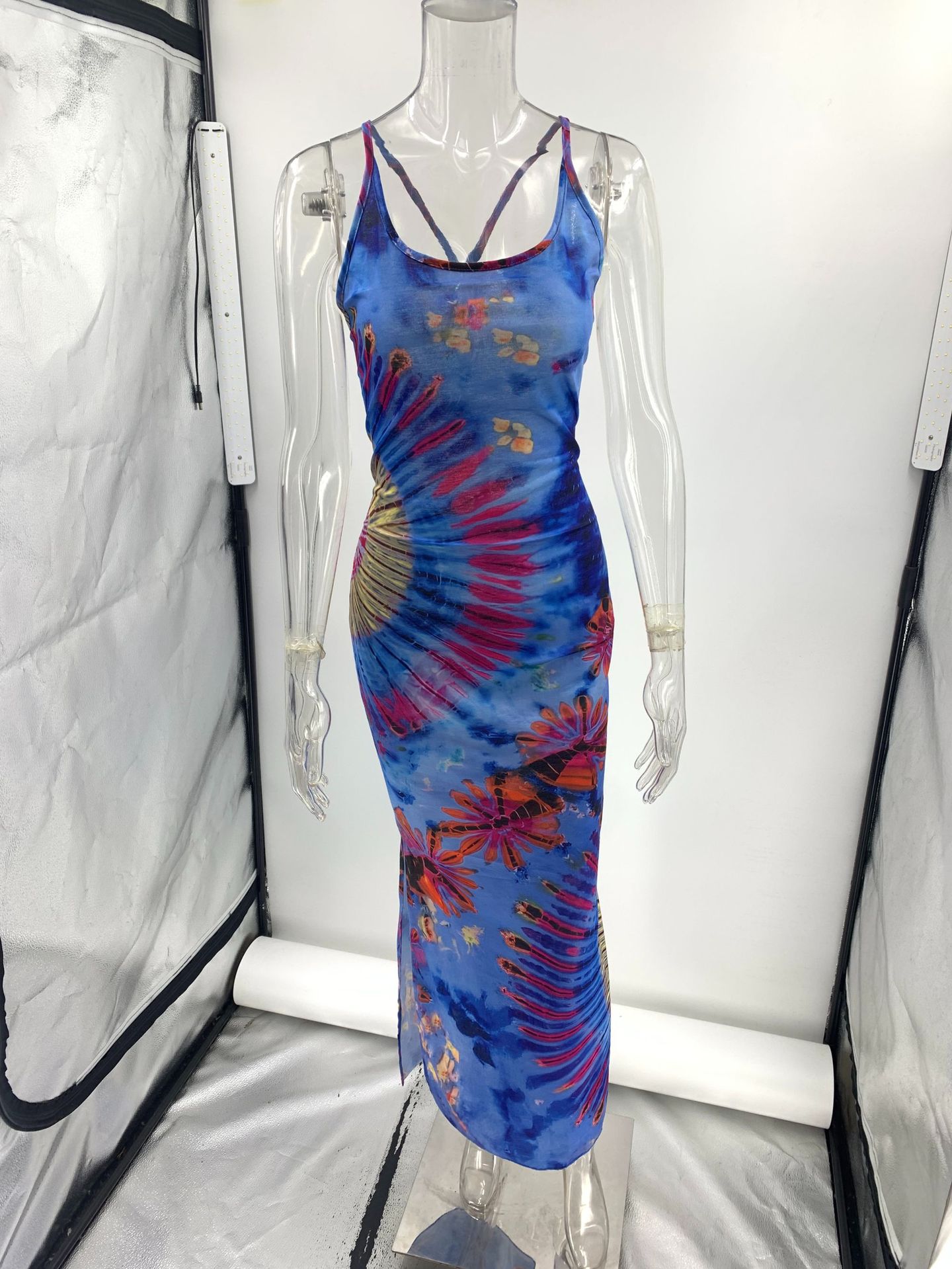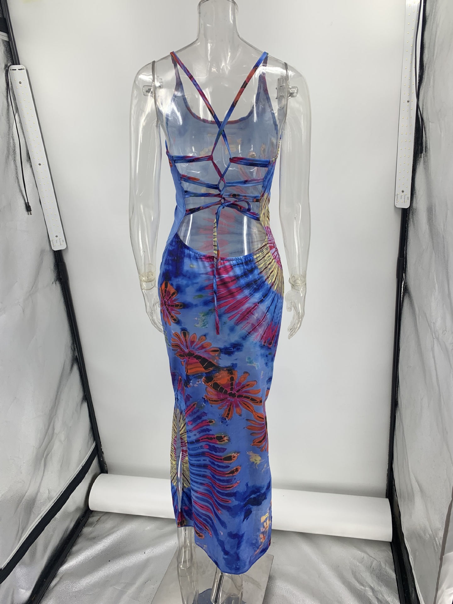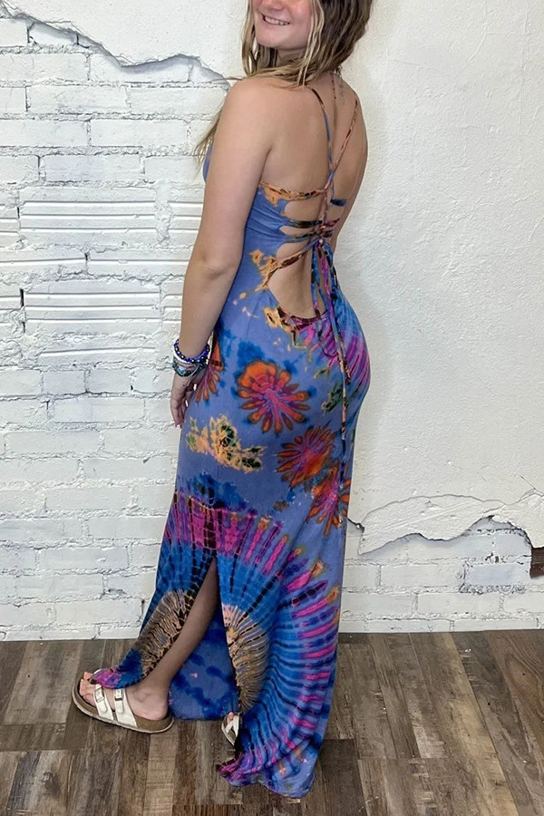 Sexy Slim Printed Backless Self Tie Slit Dress Women