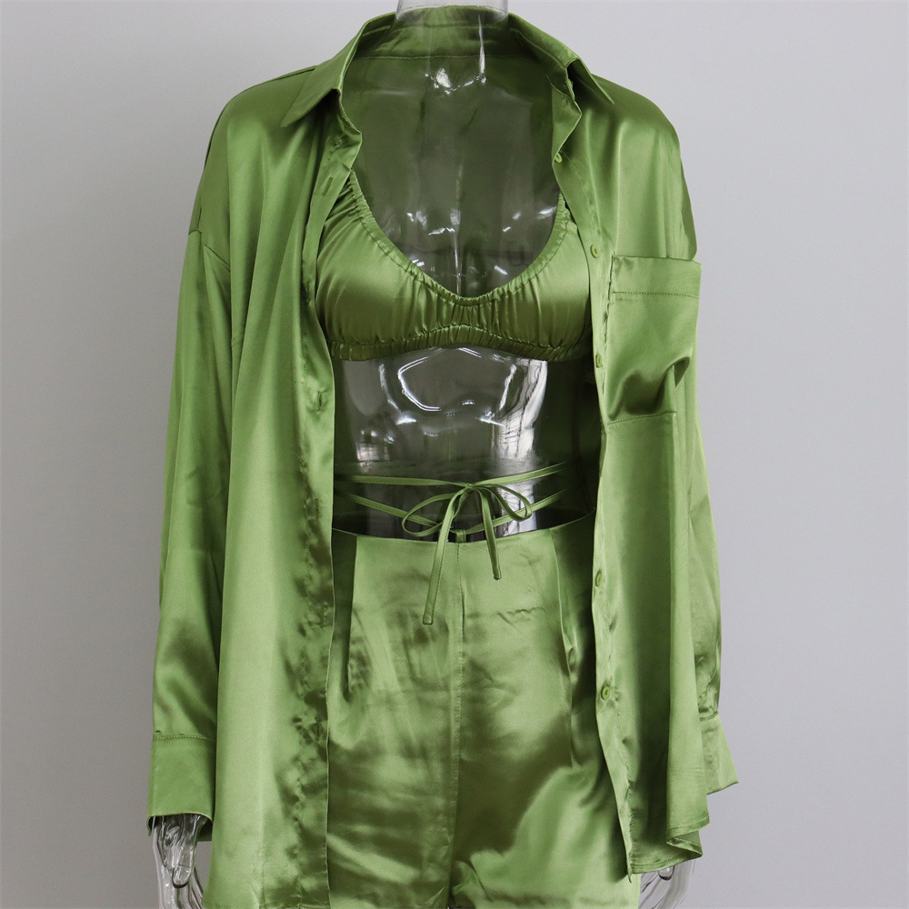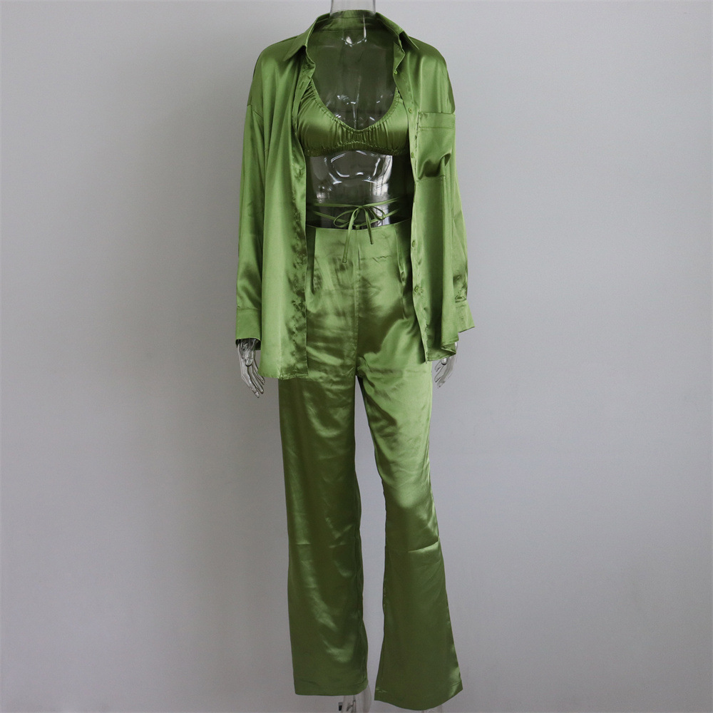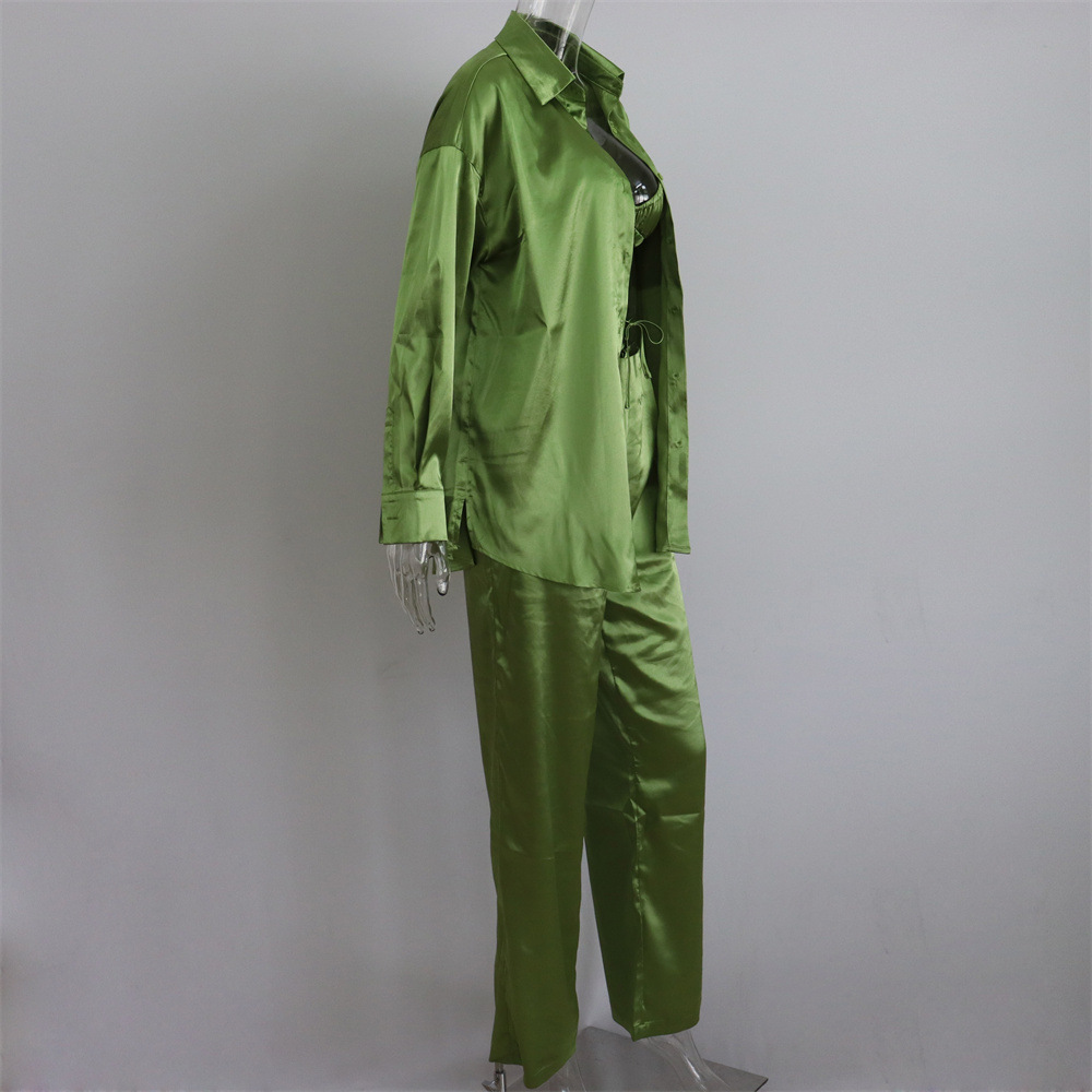 Sexy Women Wear Spring Summer Casual Vacation Three Piece Suit Satin Shirt Vest Straight Leg Pants Suit