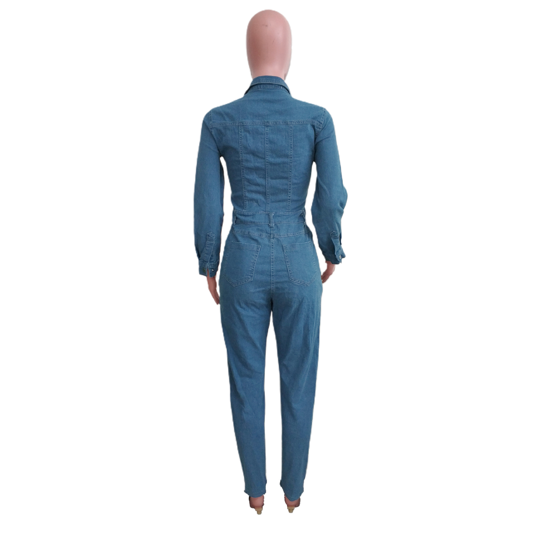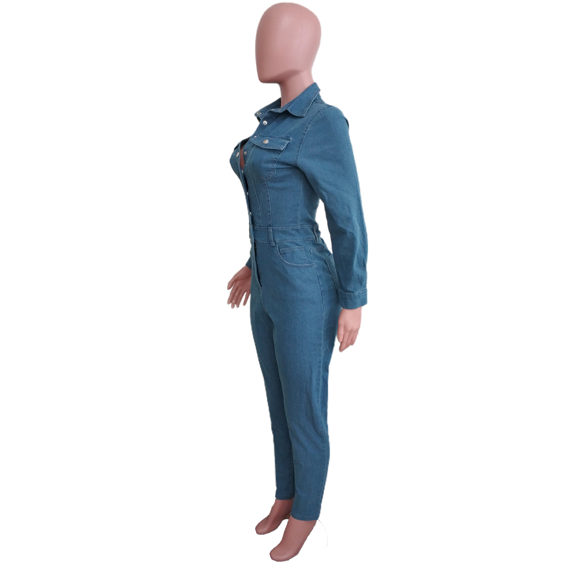 Slim Fit Stretch Long Sleeve Feet Mouth Wash Denim Jumpsuit Jumpsuit