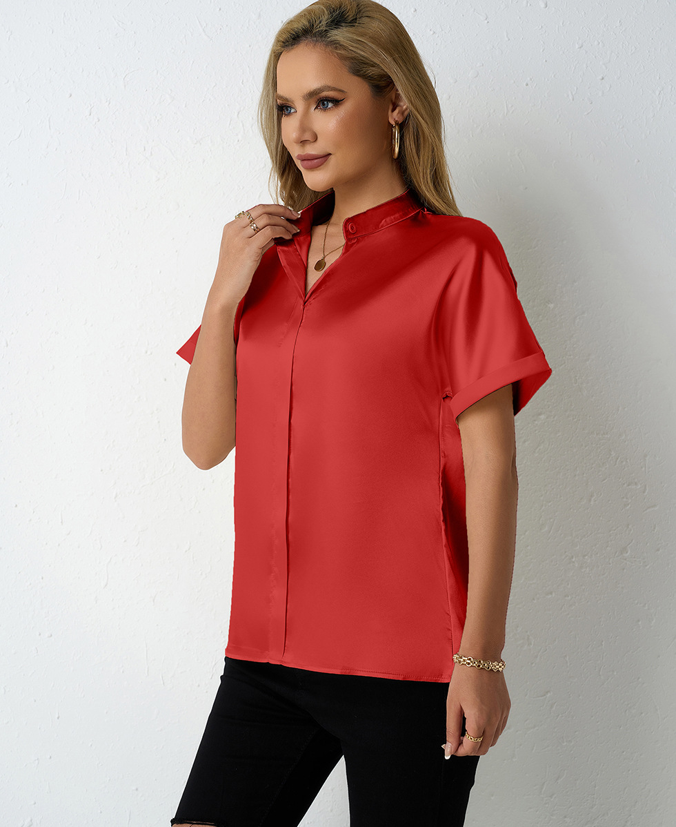 Solid Color Satin Women Clothing with Shoulder Stand Collar Short Sleeve Shirt Satin Shirt