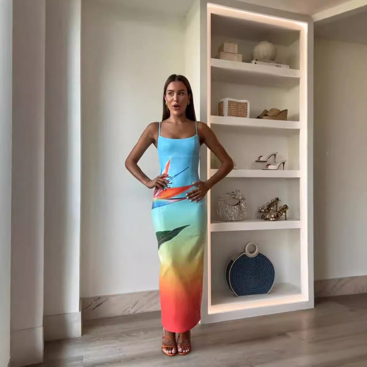 Spring Autumn Suspender Sequin Printing Dress Casual Party Split Dress