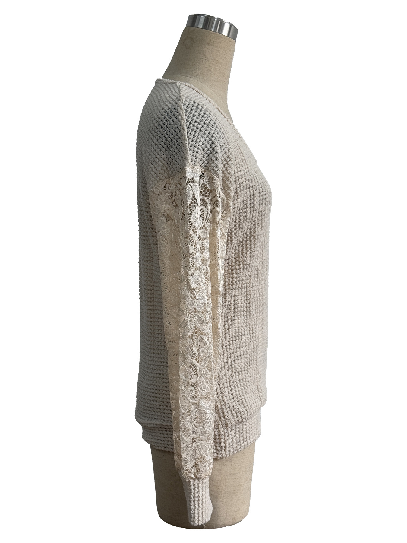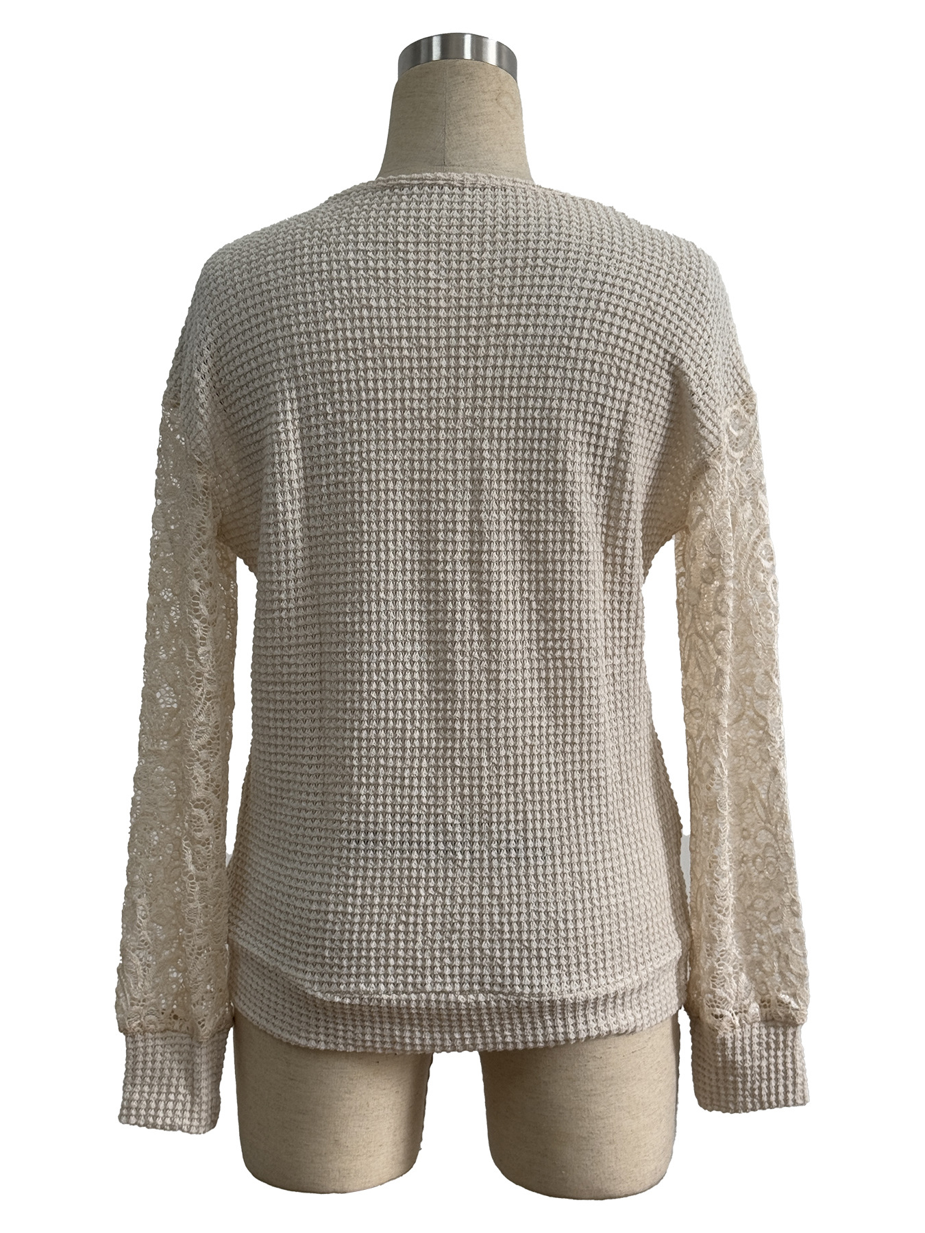 Spring Elegant Women Solid Color V neck Lace Stitching Long Sleeved T shirt Top for Women