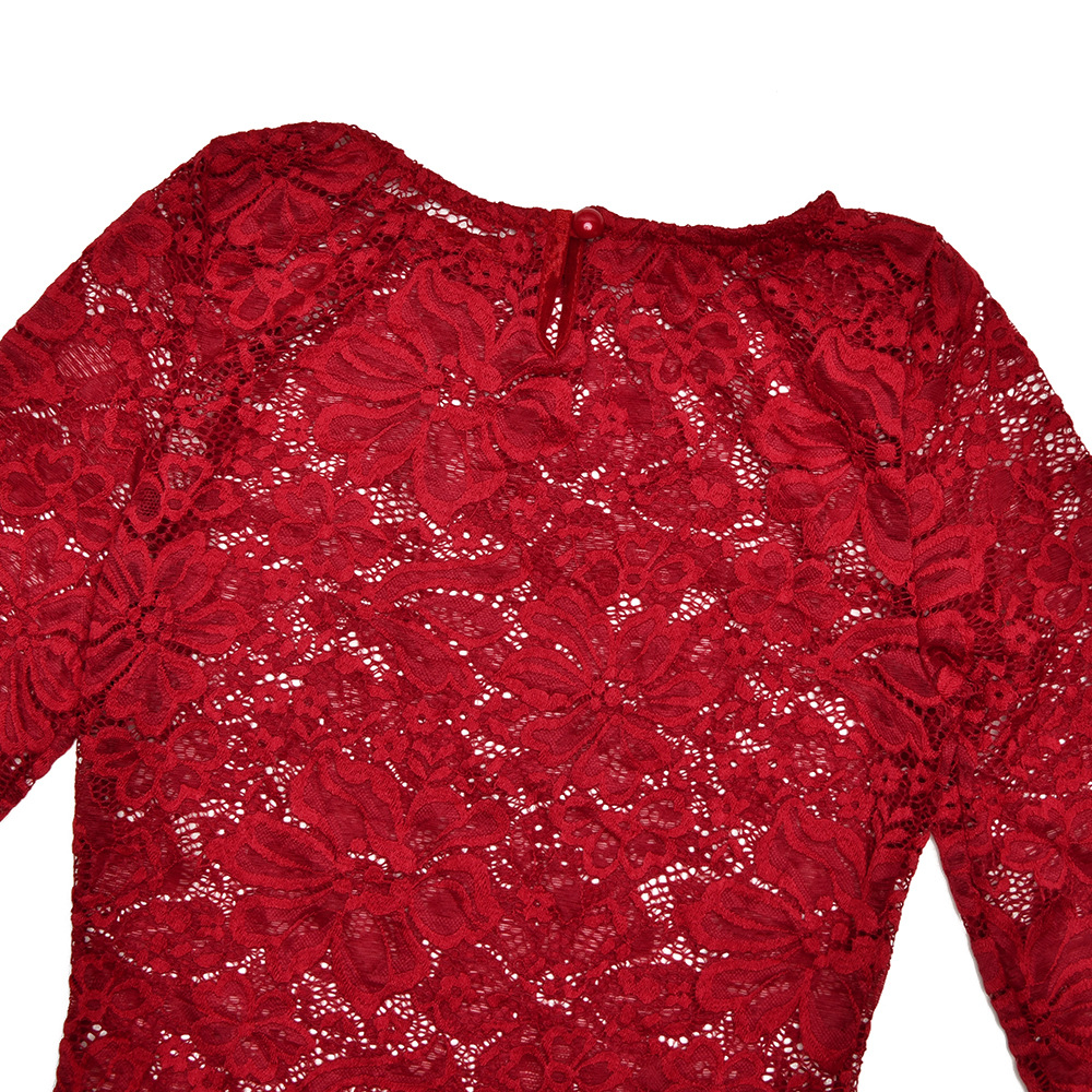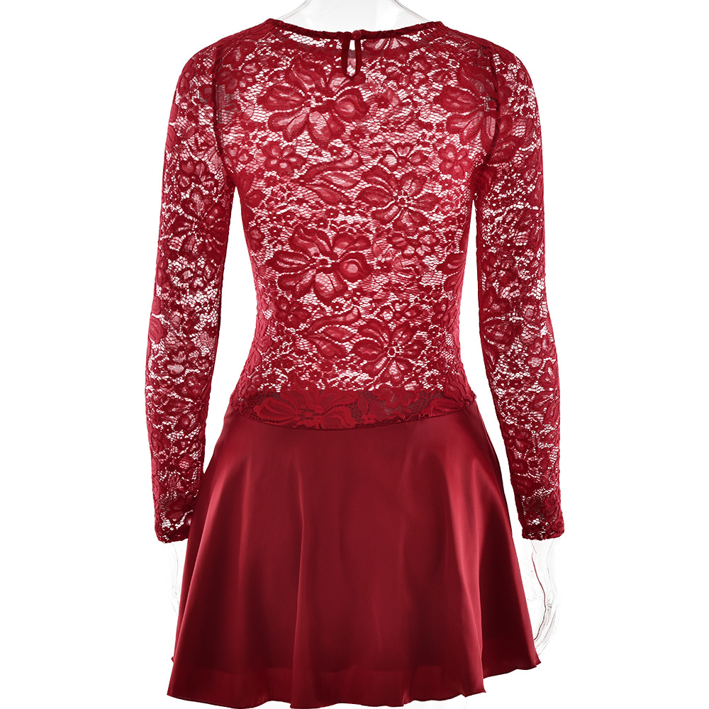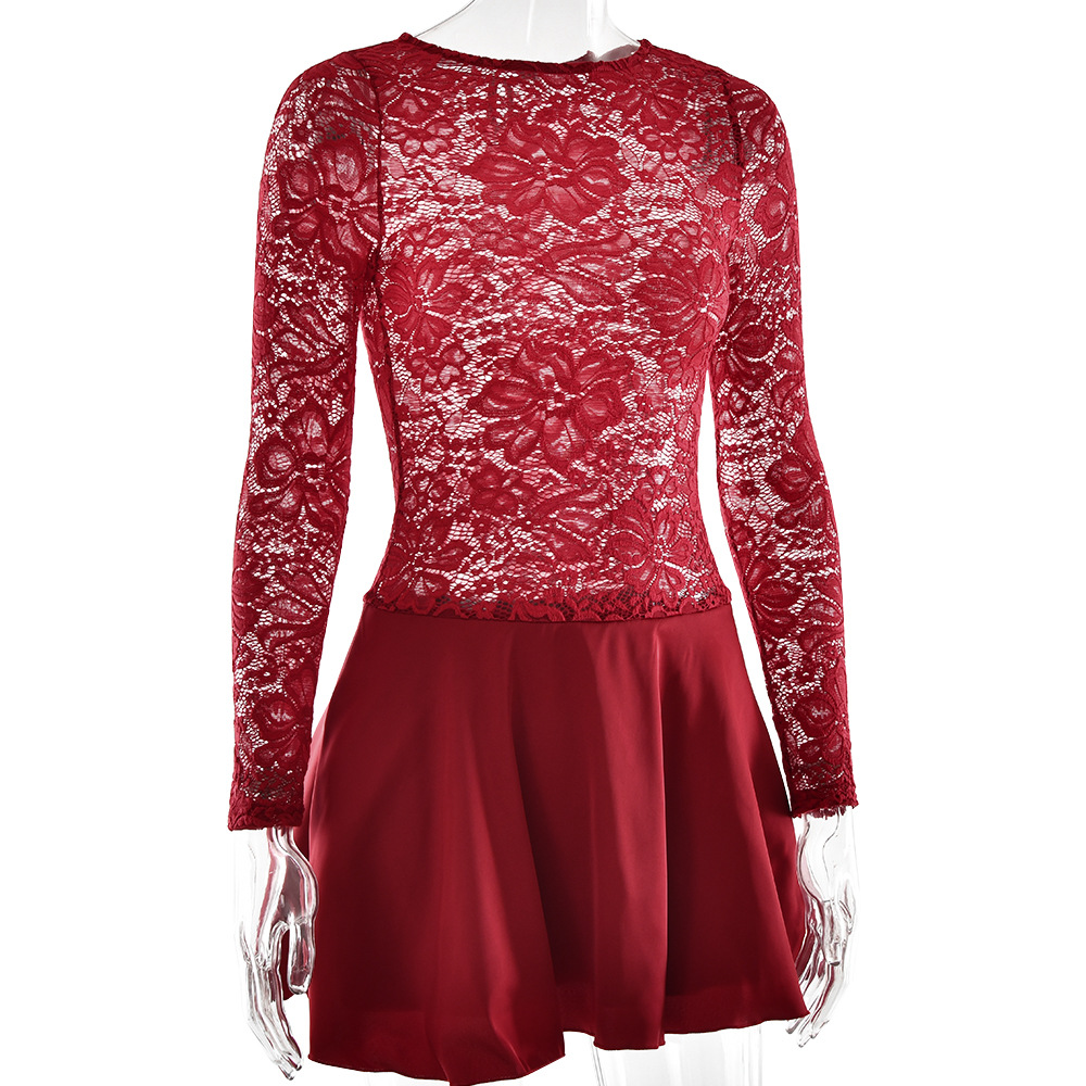 Spring Summer Lace Short round Neck Hollow Out Cutout out Slim Fitting Patchwork Ruffled Long Sleeve Dress