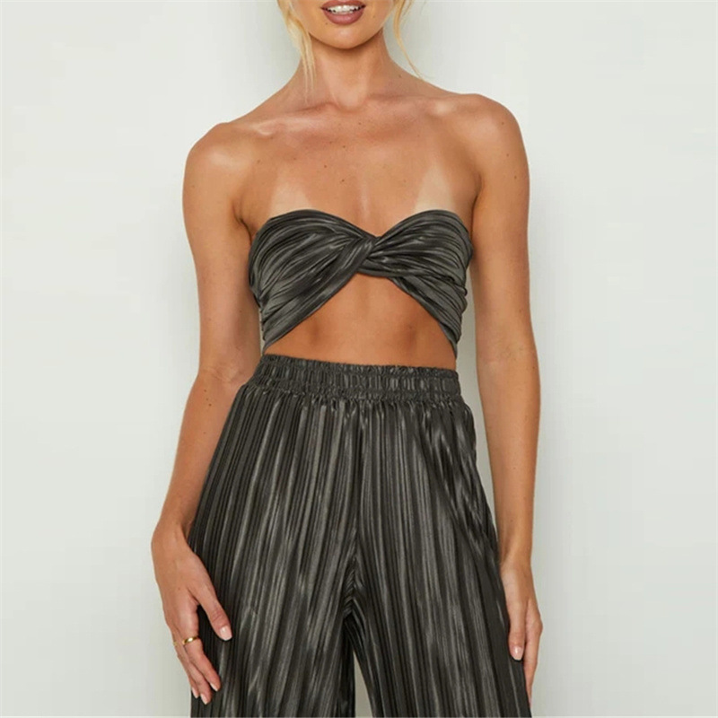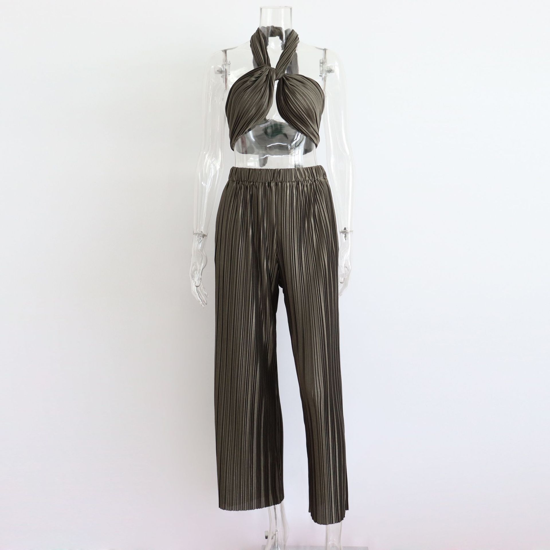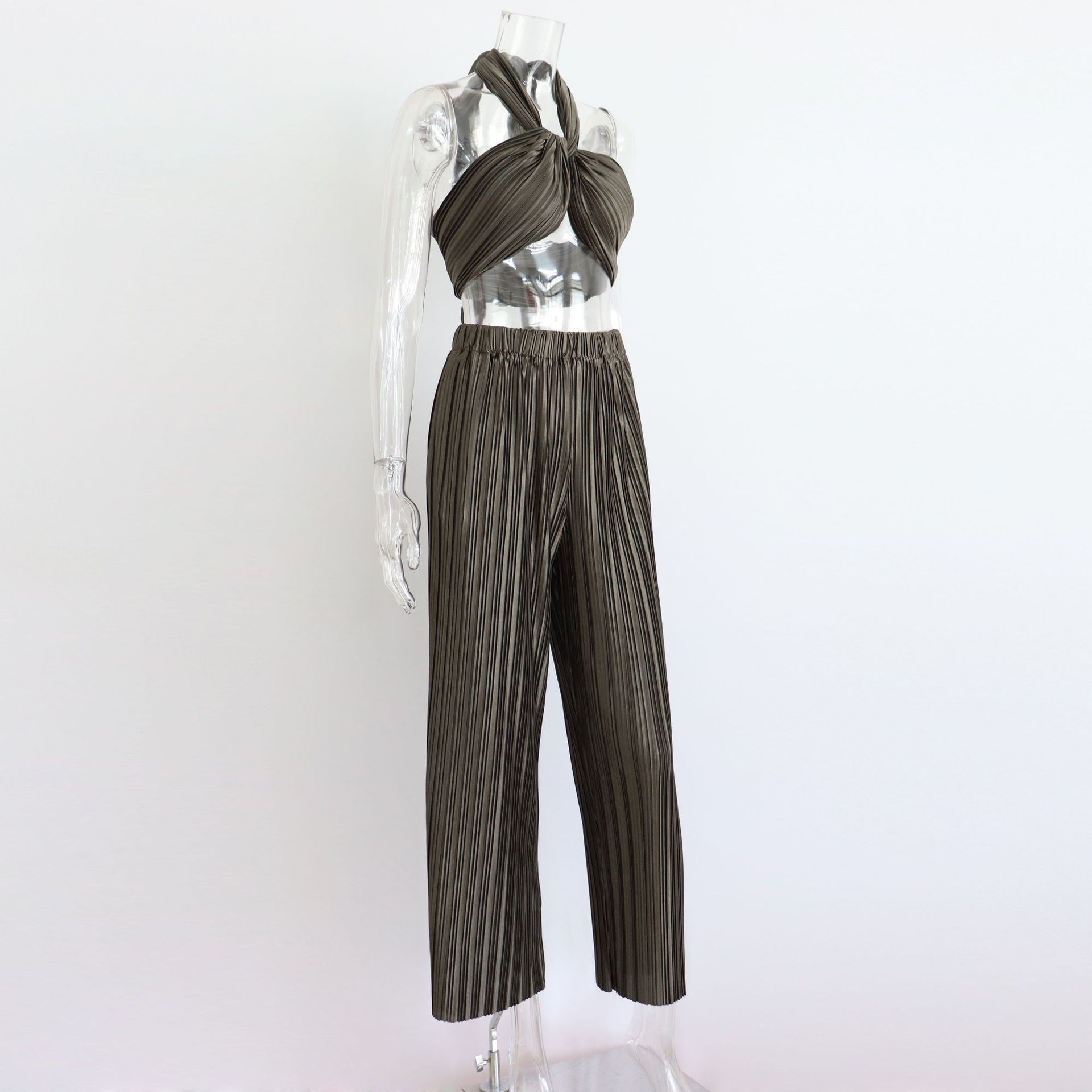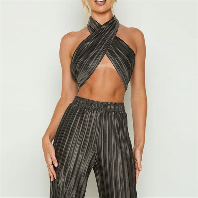 Spring Summer Pleated Sexy Suit Women Cropped Sleeveless Adjustable Vest Casual Pants Two Piece Set for Women