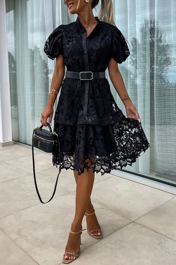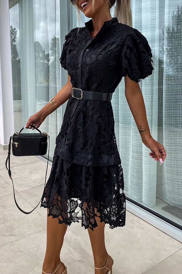 Spring Summer Single Breasted Lace Dress Loose Vacation Belt Dress Women