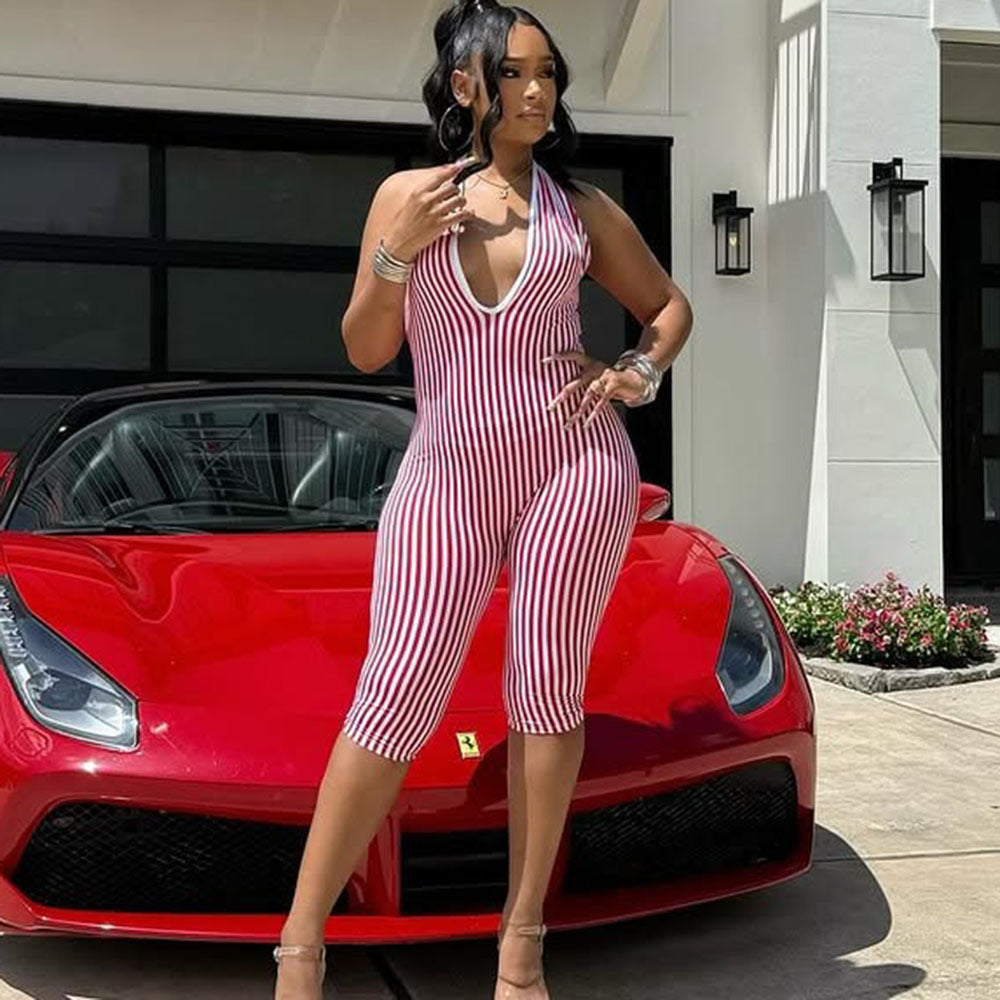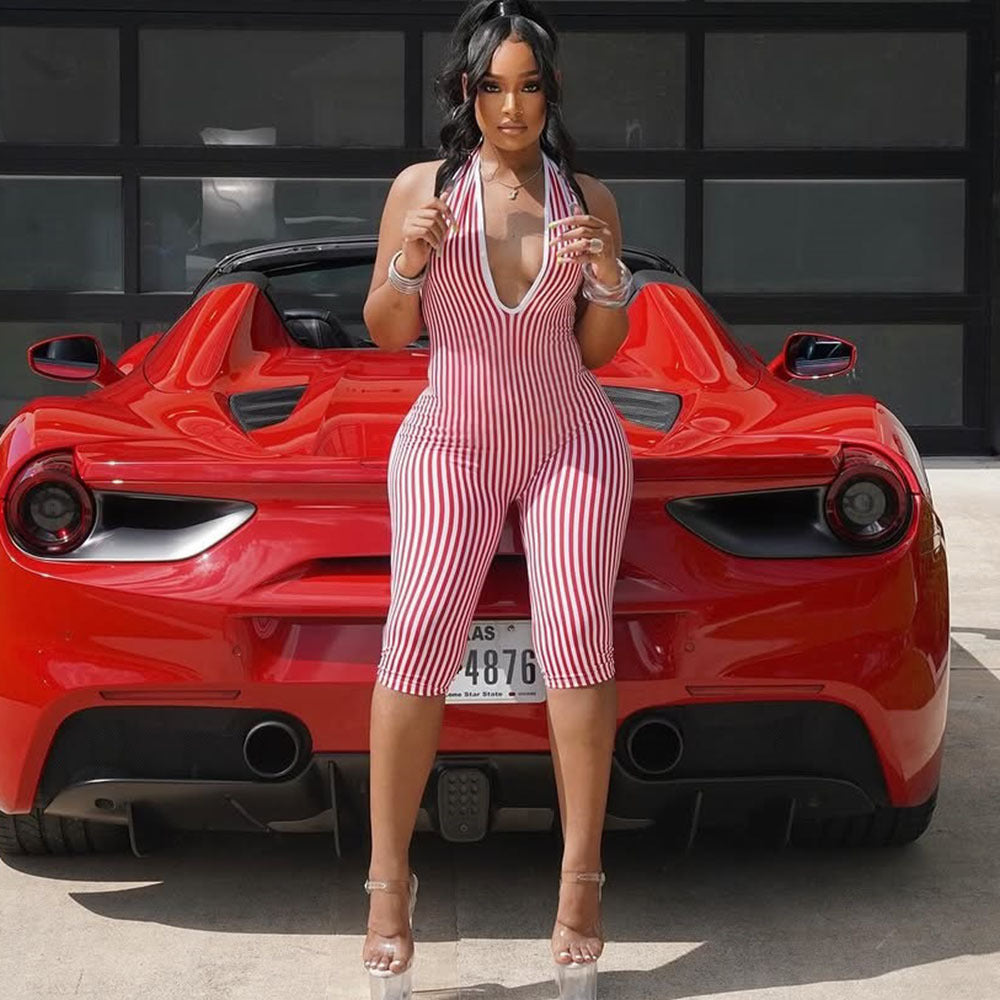 Stripes Hollow Out Cutout Backless Lace up Short High End Jumpsuit Women